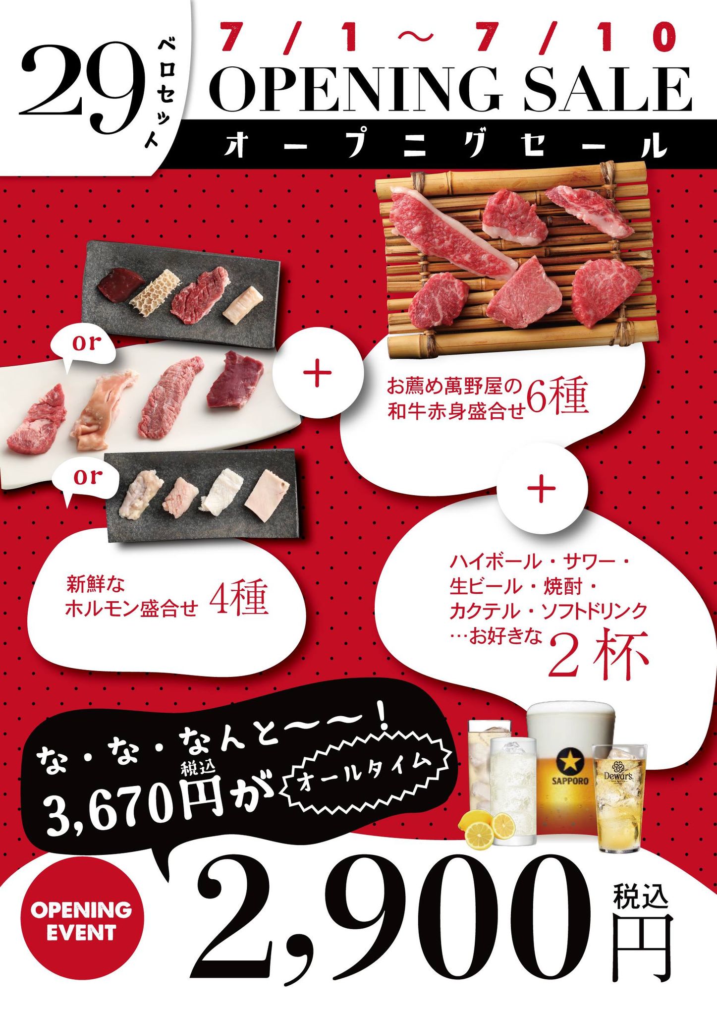 内容:通常3670円(※ハイボール550円の場合)のセット料理を2900(肉)円(税込)で提供