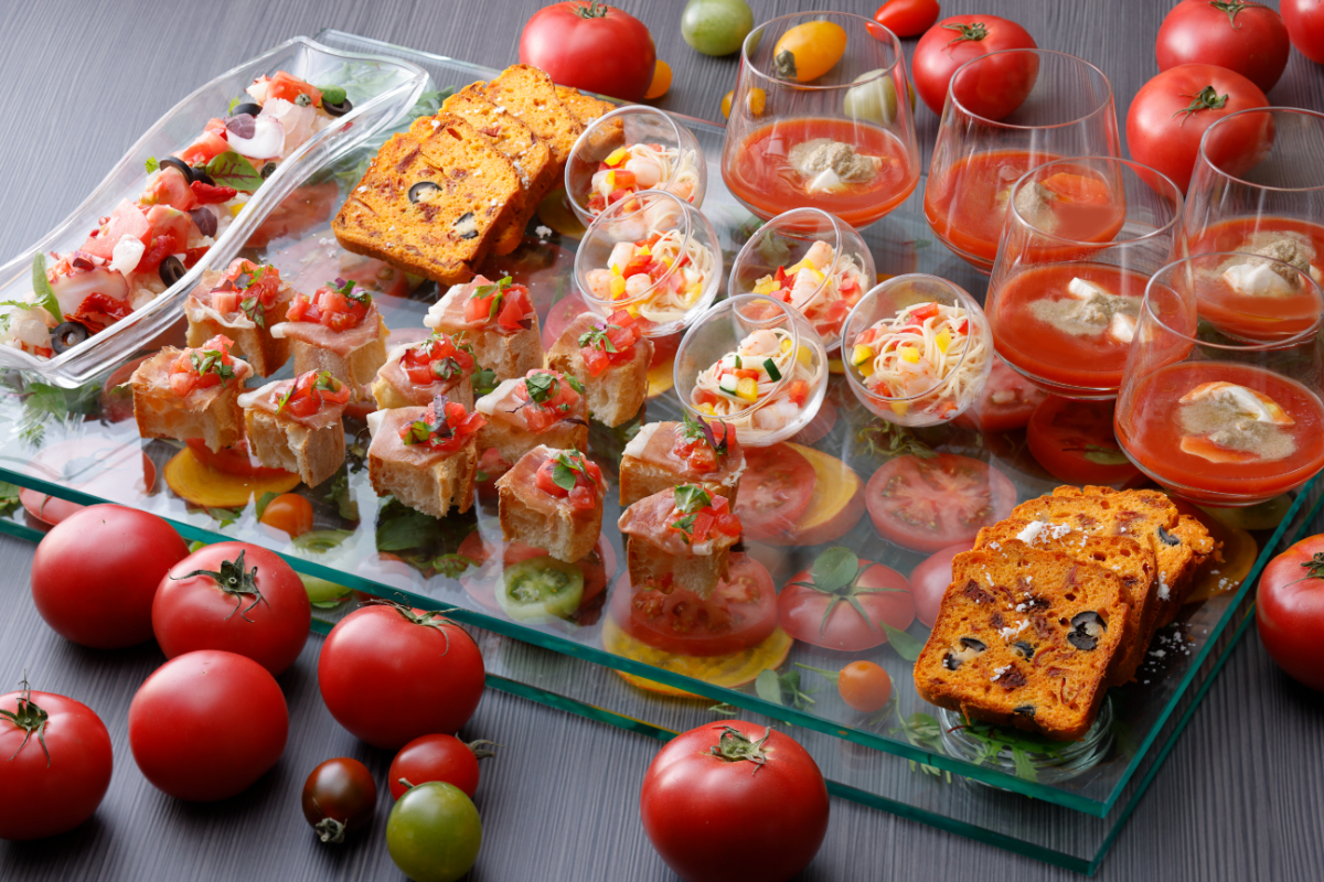 スイカの果実味がアクセントになった「トマトのガスパチョ」や、色鮮やかな「トマトと小えびの冷製パスタ」、「トマトのブルスケッタ」や、トマトの酸味がほどよい「ドライトマトとオリーブのケークサレ」などバラエティ豊かなお料理をお楽しみいただけます。