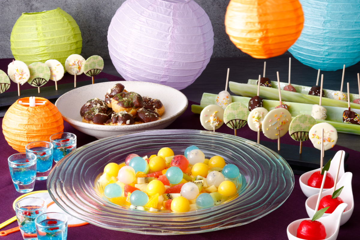 スイーツではりんご飴に見立てた「りんご飴仕立てのムース」や、団扇に見立てた「パレットショコラ」など見た目も可愛らしいスイーツでさらにお祭り気分を盛り上げます。