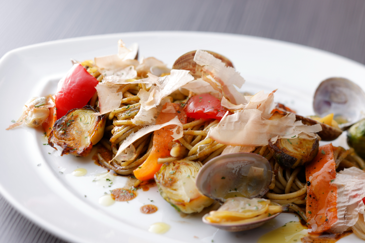 やきそばをイメージしたスパゲティーニ。アサリのお出汁の香りと、バルサミコ酢の程よい酸味が食欲そそる一皿。