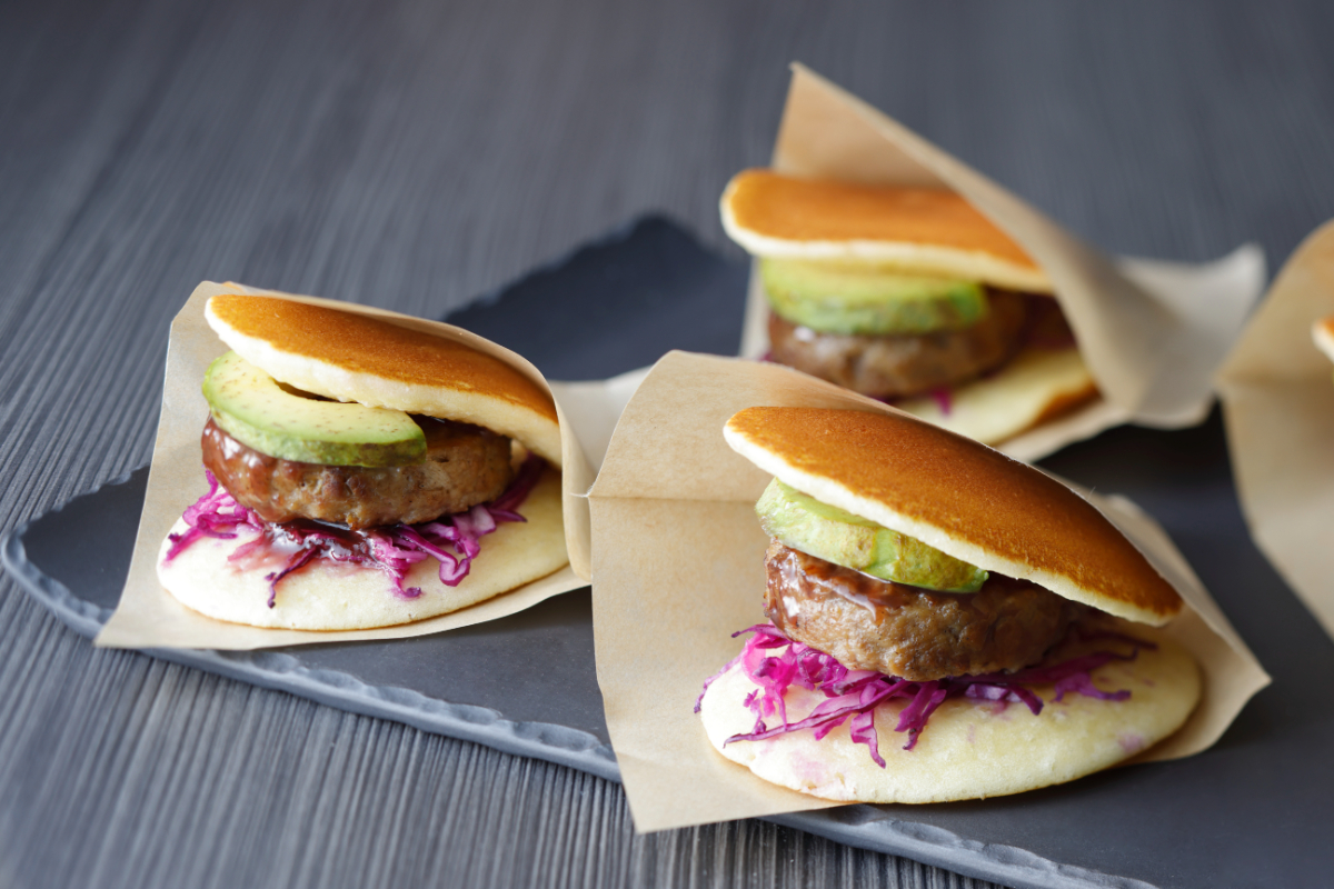 ふっくら焼き上げたハンバーグとアボカドをパンケーキでサンド。小ぶりで片手で食べられるサイズ感が、食べ歩き気分を演出いたします。