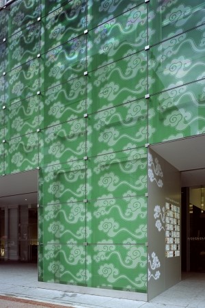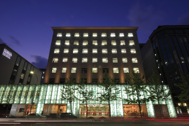 「COCON KARASUMA」の前身は、丸紅呉服店(現在の丸紅株式会社)が1938 (昭和13)年に建てた、当時の京都最大といわれた旧丸紅ビルです。日建設計の源流である設計事務所・長谷部竹腰建築事務所が手掛けた近代の名建築です。第二次世界大戦後、戦火を免れた同ビルは無傷のまま進駐軍(GHQ)に接収された歴史があります。耐震補強を施し、2004 (平成16)年に隈研吾氏によるリノベーションを経て再生しました。印象的なタイルの外壁を修復して保存し、商業施設が入る低層部分にガラスのファサードを付加することによって時間の重層を表現しています。ガラスには1階に店を構える唐紙の老舗「唐長」に伝わる文様「天平大雲」を施し、ライトアップすると緑色の柔らかな光を放ち、烏丸通に彩りを添えています。当施設は歴史的に価値のある建築物を優れた改修により再生させた功績から、公益社団法人ロングライフビル推進協会より第16回BELCA賞ベストリフォーム部門を受賞しました。