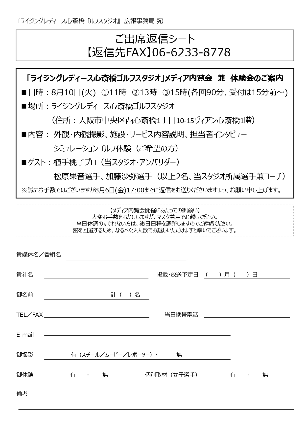 ※誠にお手数ではございますが8月6日(金)17:00までに返信をお送りくださいますよう、お願い申し上げます。