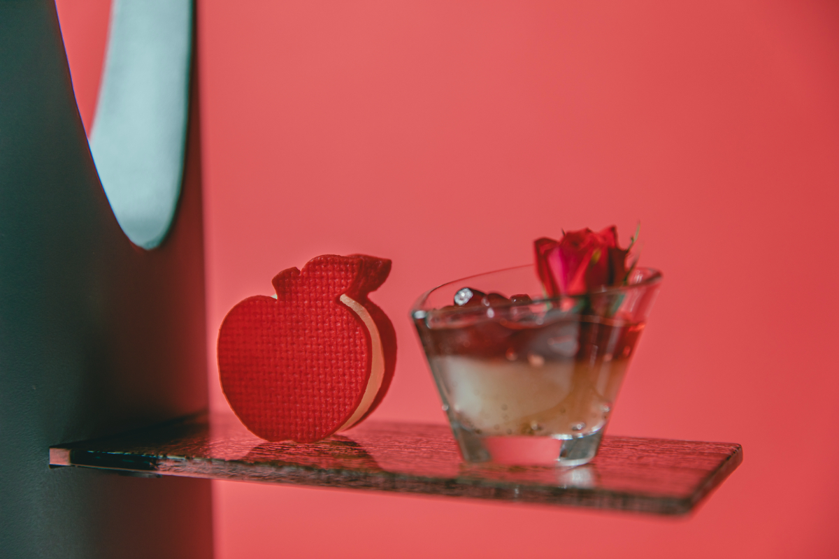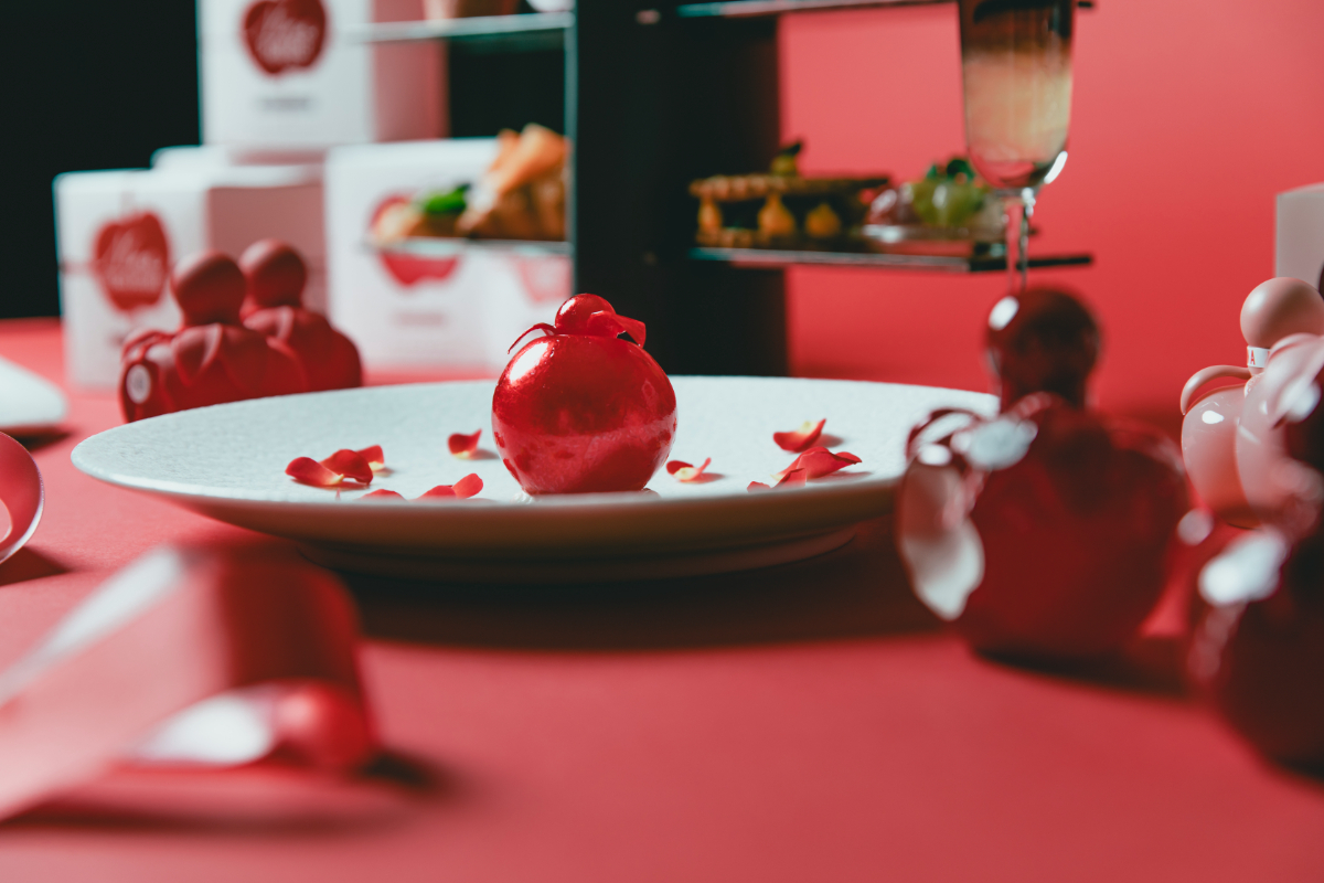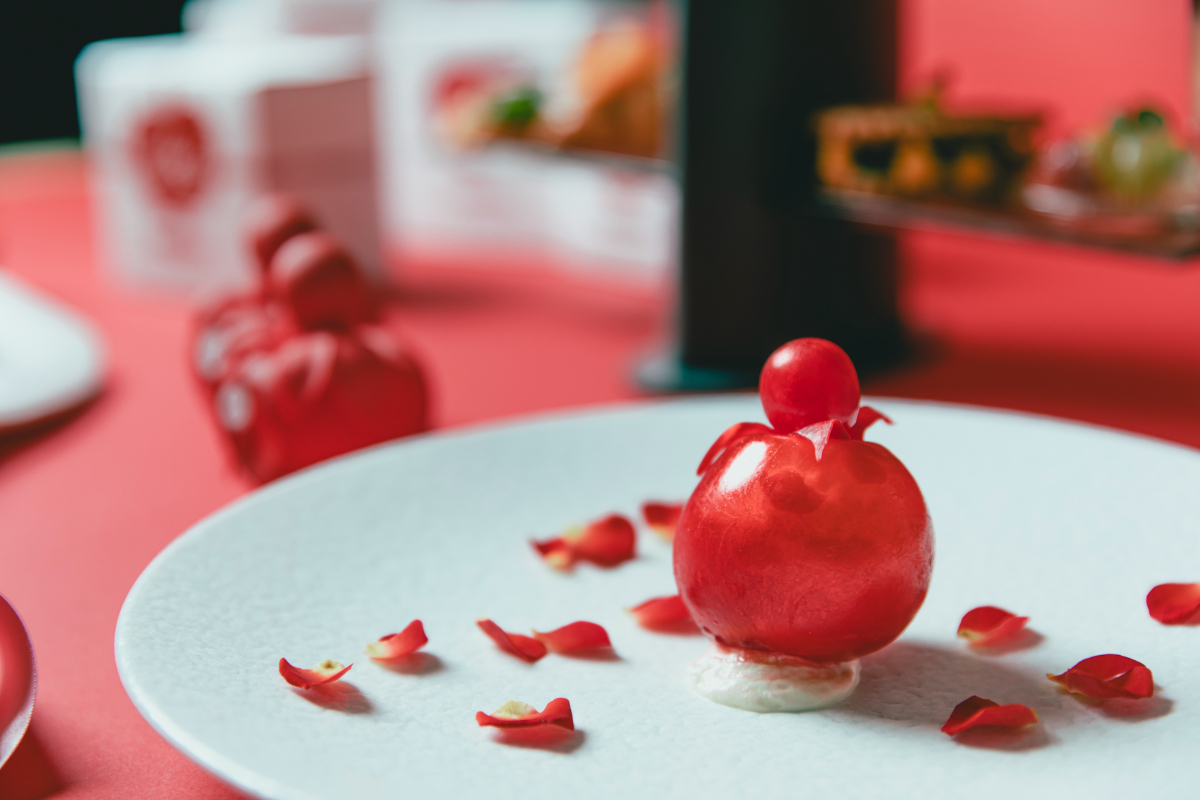 ニナ リッチの新作「ニナ エクストラ ルージュ」をスイーツで表現した一皿。アップルシェイプのボトルを再現した飴細工のシェルの中には、ローズとバニラのエスプーマとフランボワーズの果肉が閉じ込められています。重層的な風味が口の中で広がり、五感を通じてニナ リッチの世界観を味わえる軽やかな一品です。