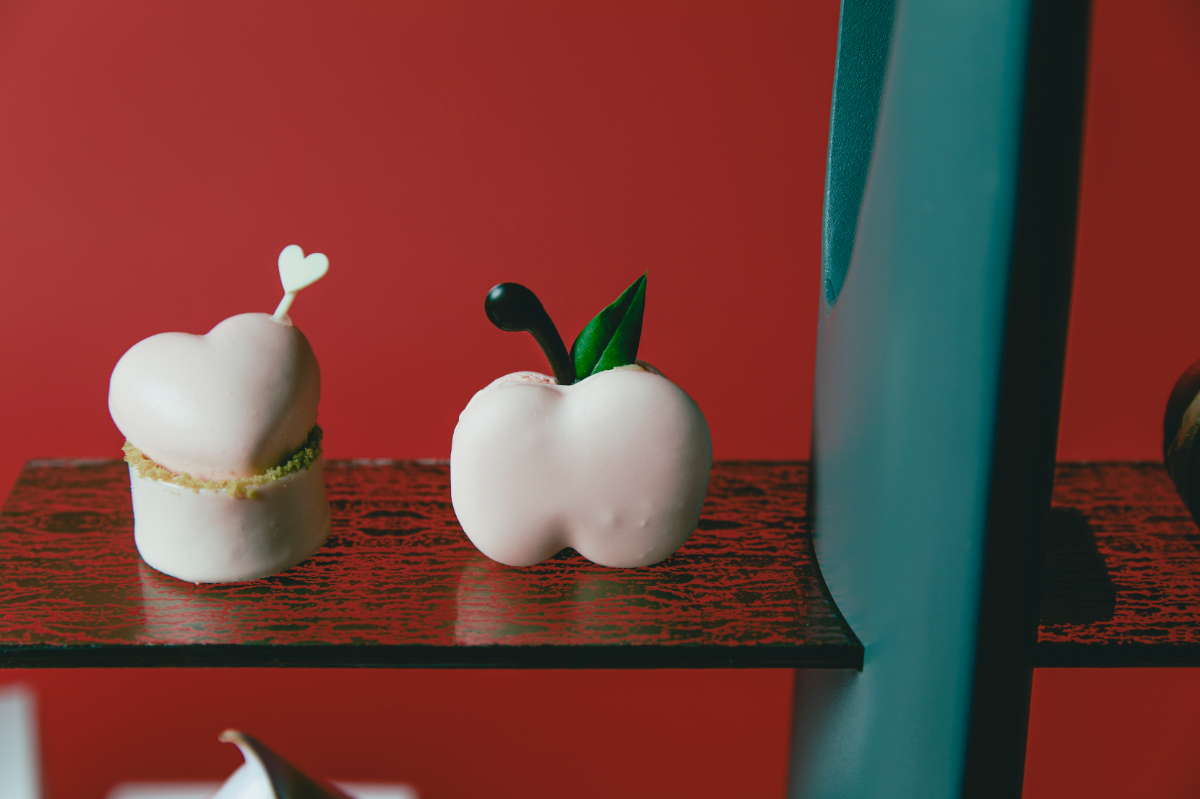 スタイリッシュなティースタンドに並べられたスイーツは、ニナ リッチがこれまでに手掛けてきたコレクションを表現したメニューラインナップです。艶やかなレッドに塗られたボトルが印象的な「ニナ ルージュ」にインスパイアされたリンゴ型のサブレサンドやグラスジュレ、ローズの新鮮さと陽気さを包み込んだ「ニナ ローズ」をモチーフにしたタルトやマカロンなど、スイーツ1つひとつにNINAコレクションのエッセンスが加えられています。