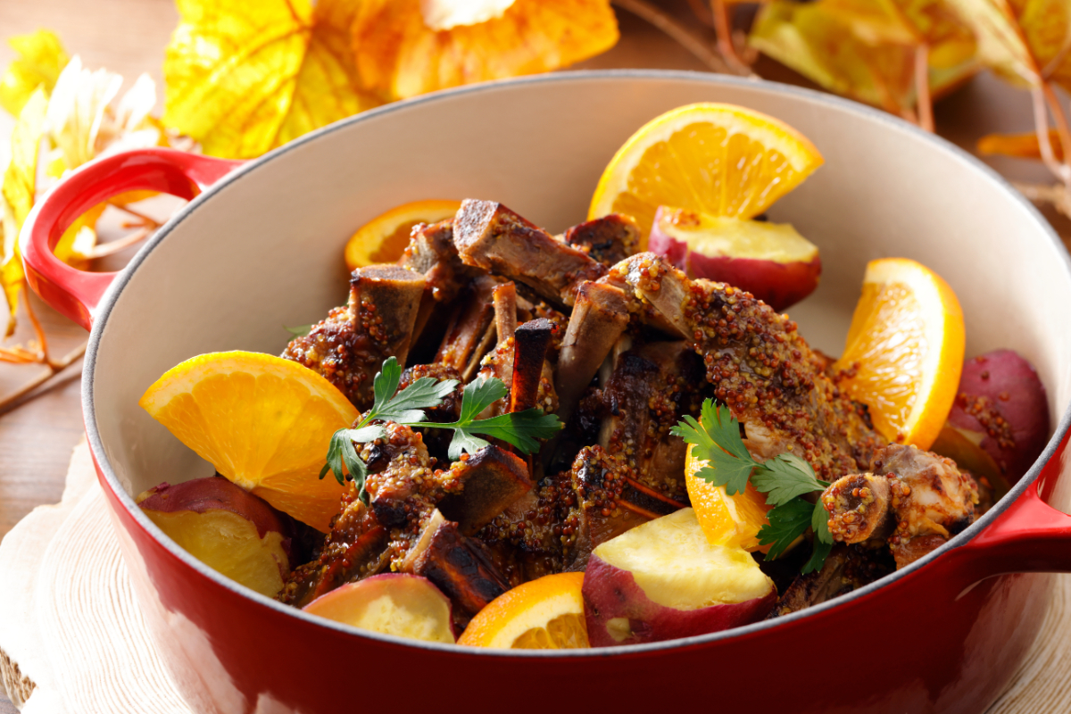 甘辛い味付けのスペアリブとハニーマスタードソースの相性の良い一品。爽やかなオレンジを添えて。