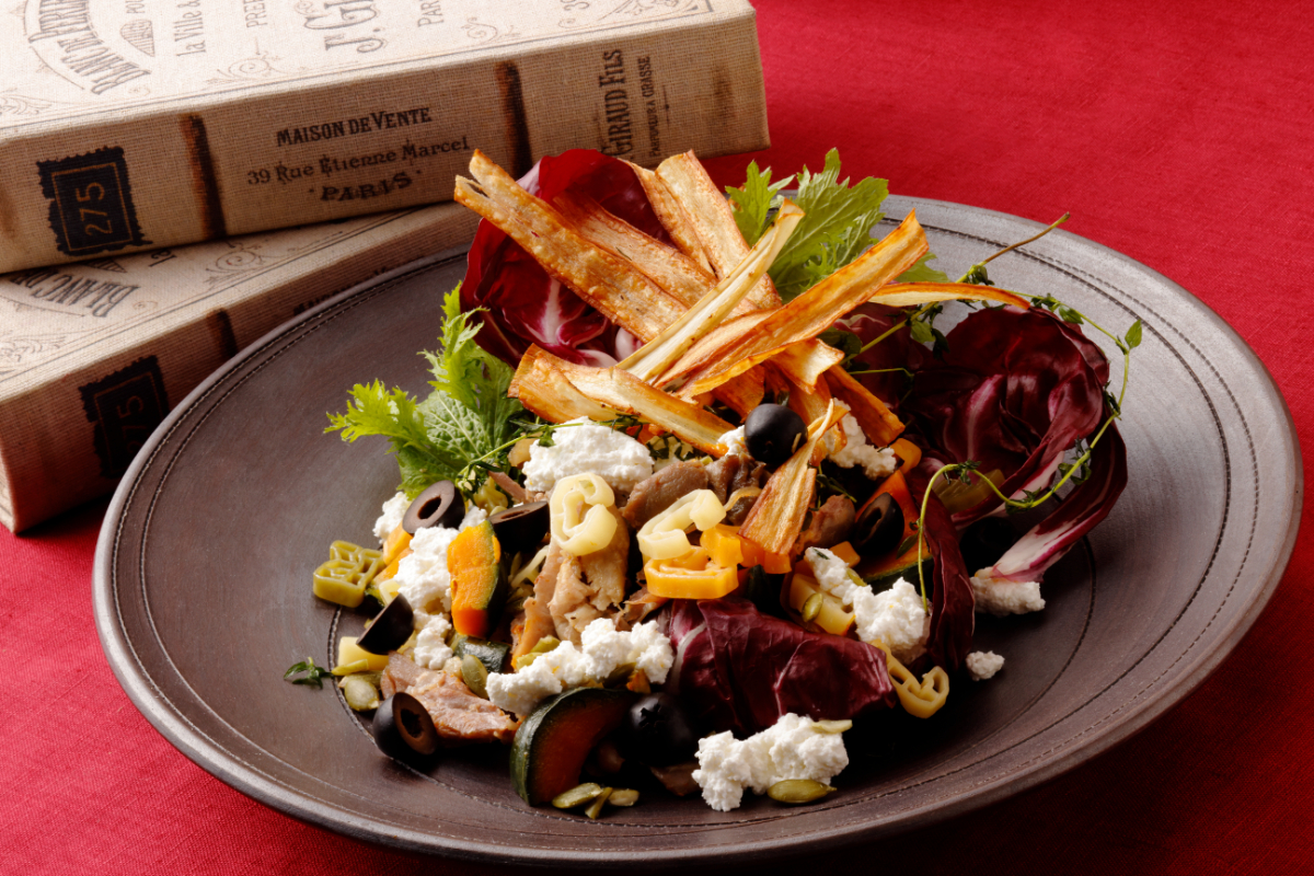 しっとりとした鴨肉のコンフィと自然な甘みのカボチャを合わせたごちそうサラダ。牛蒡のフライが良いアクセントに。
