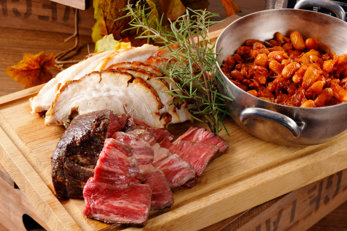 ラジョウの定番「じっくり焼いたポルケッタ」は、ローズマリーやパセリなどのハーブとニンニクの風味を効かせた豚肉を丁寧に焼き上げた逸品。ビュッフェラインで、1皿1皿シェフが目の前で仕上げご提供いたします。香り高いハーブと柔らかな肉質のポークのハーモニーをご堪能いただけます。