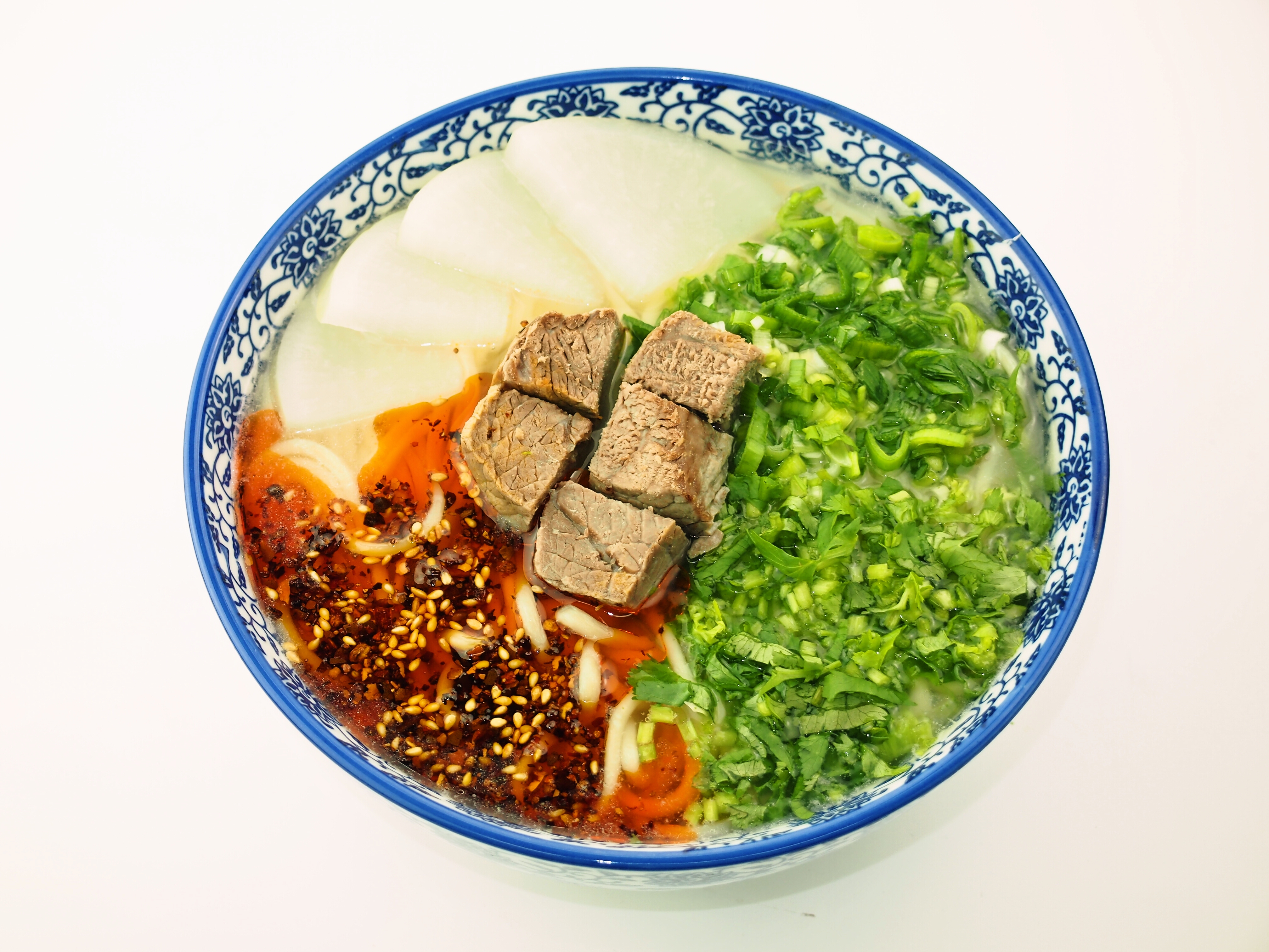 【一清】:清らかな牛骨スープ 【二白】:上質なスープで煮込んだ大根 【三紅】:スープを引き立てる辣油