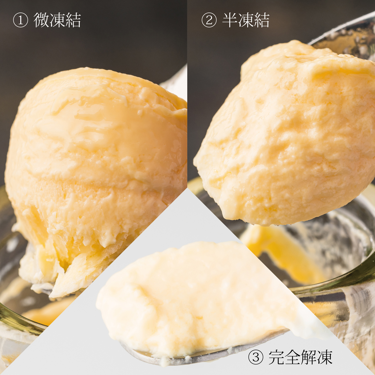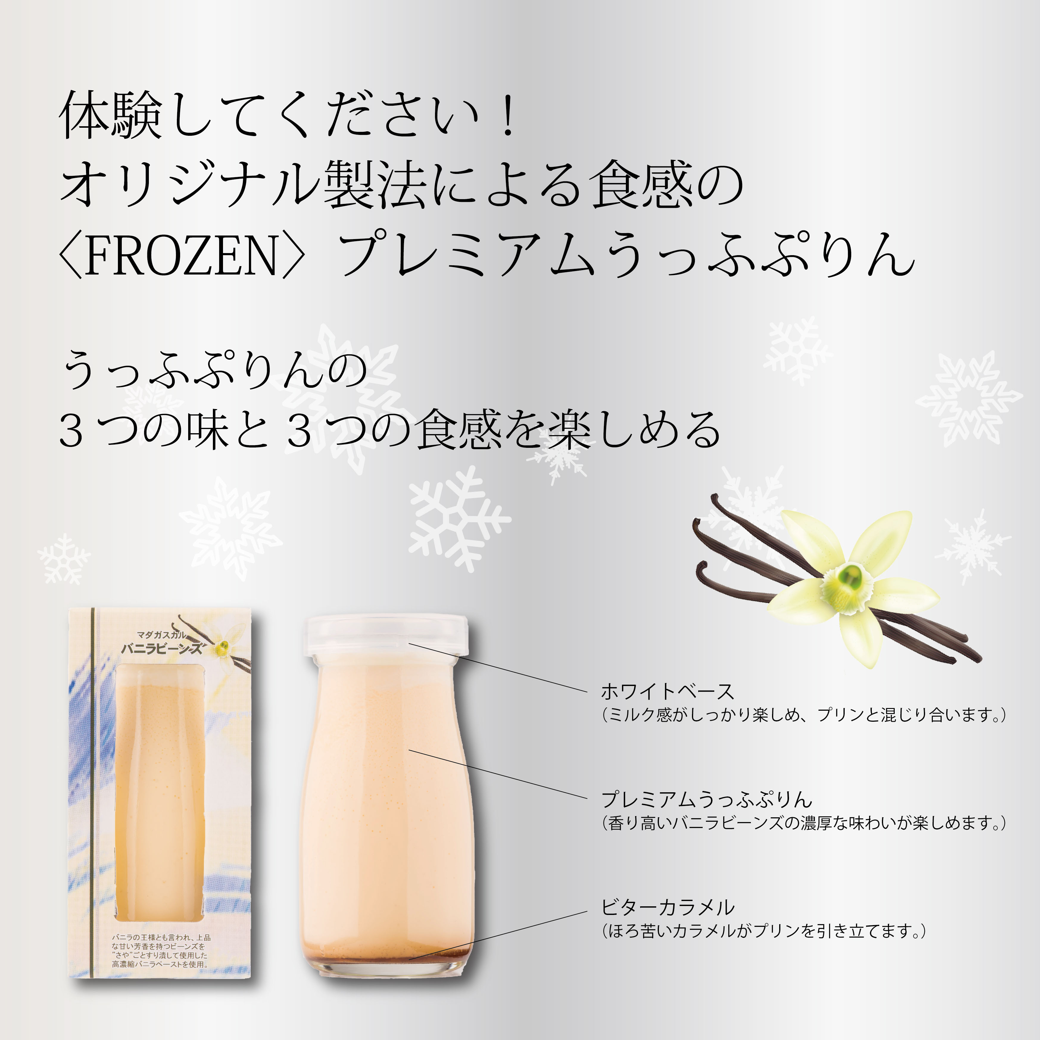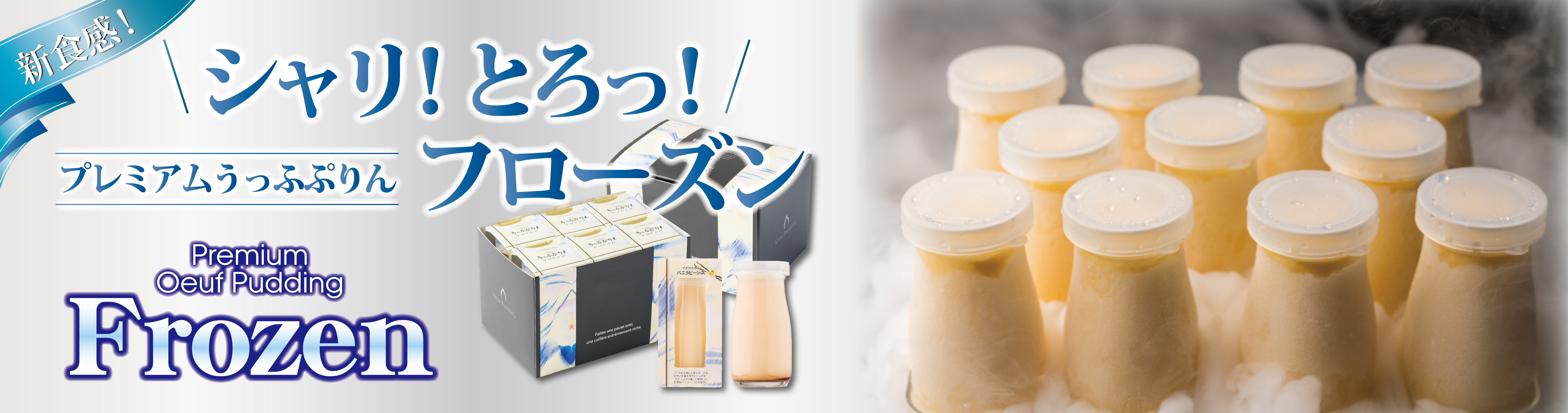 通常のプリンを冷凍解凍すると分離したように食感がぼそぼそになり、食べれた物ではありません。現在、冷凍で流通しているプリンはクレームブリュレやカタラーナなど乳脂肪や糖度を高くして分離と食感をコントロールしていますがまるでクリームを食べているような濃厚過ぎる味にならざるを得ません。しかし弊社のオリジナル製法により「FROZENプレミアムうっふぷりん」は、通常プリンのようにあっさりとした後味の中にコクの深見もあるプリンを開発し、3層の味と3つの食感を楽しめるプリンが完成しました。
