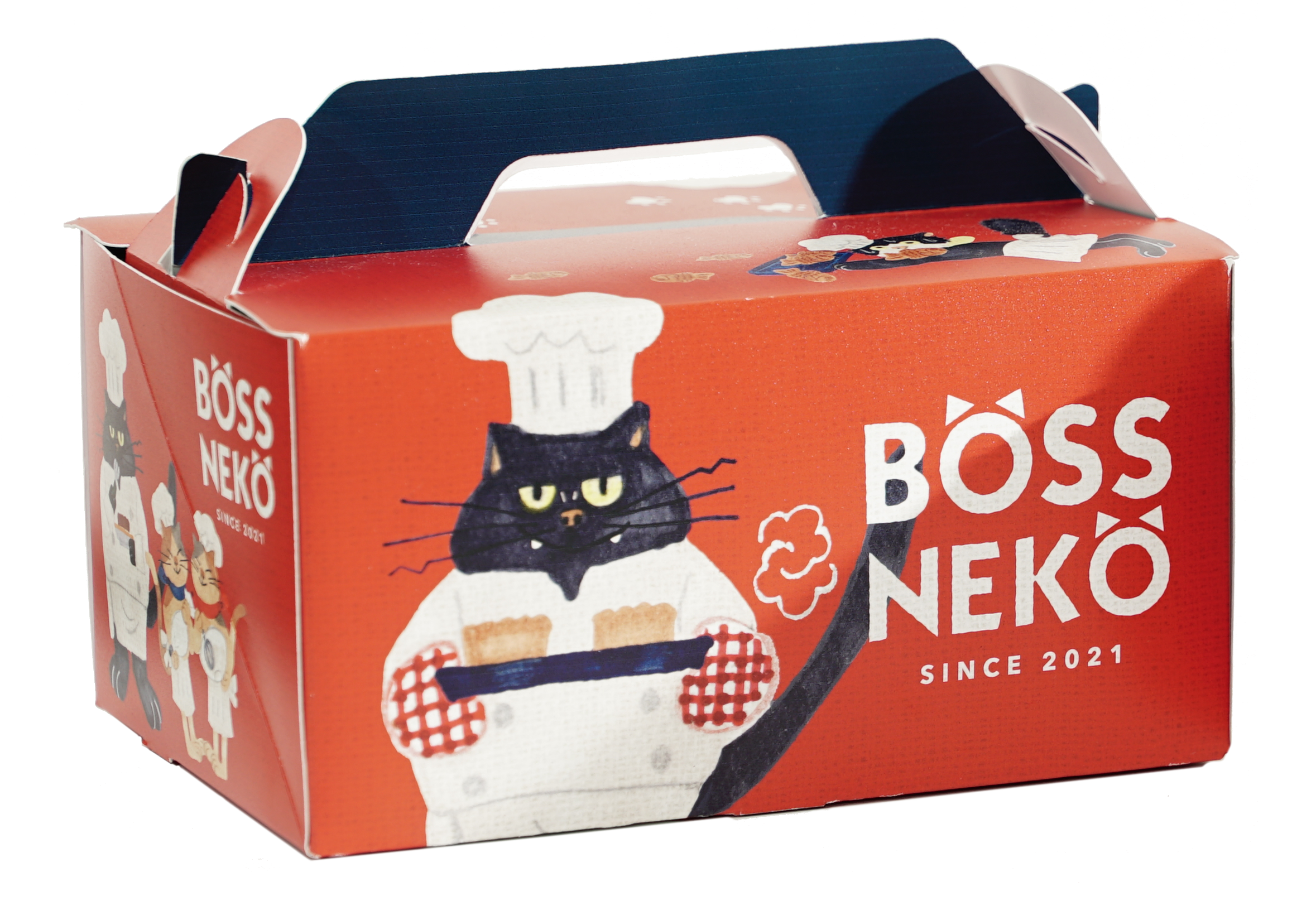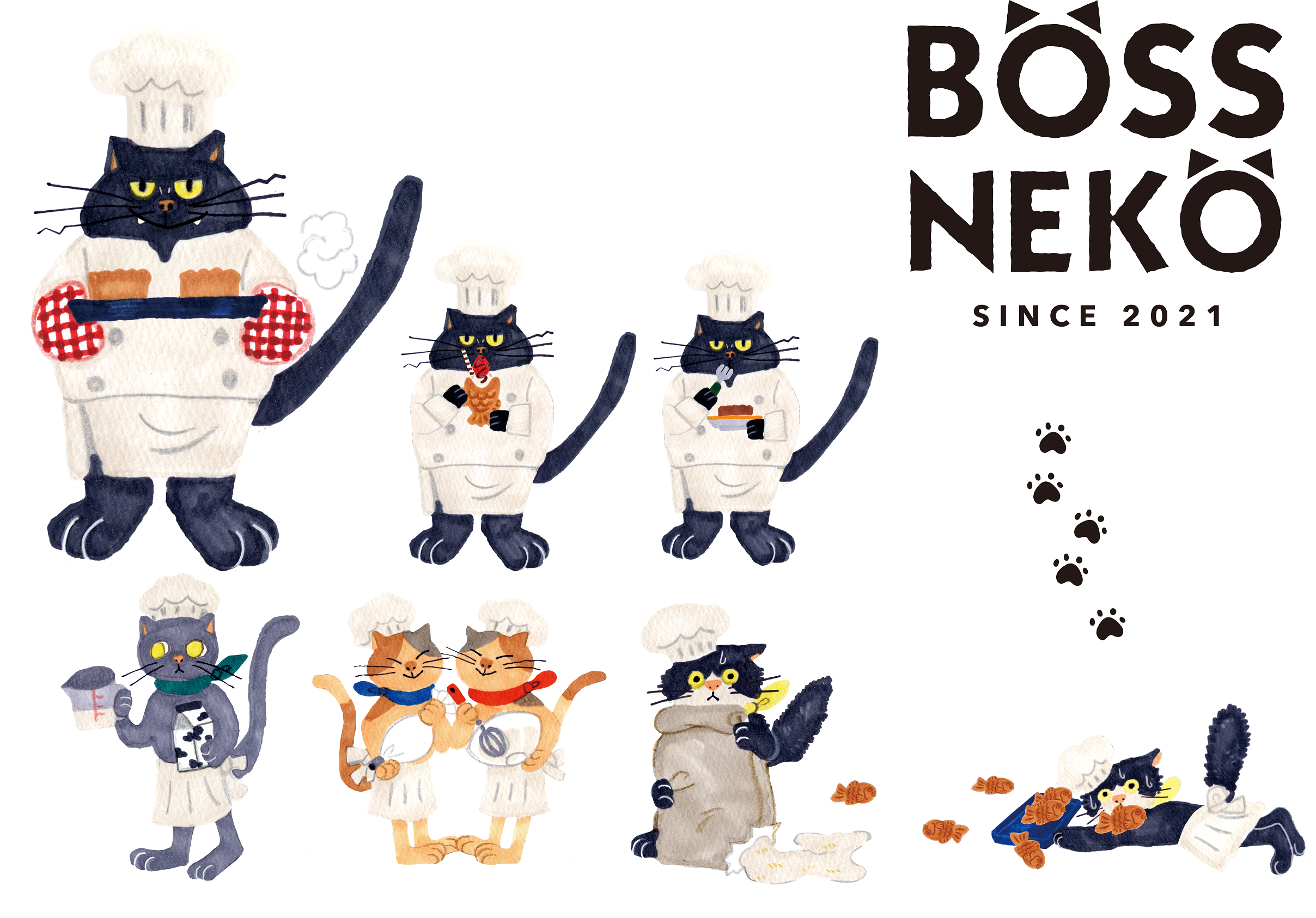 代表取締役が昔飼っていたネコが由来で名付けられた「BOSSNEKO」では、オリジナルキャラクターを展開。ボスネコ、はちわれ、どじねこ、ろしあん、双子の5匹のオリジナルキャラクターたちが、パッケージや店内を盛り上げていきます。
