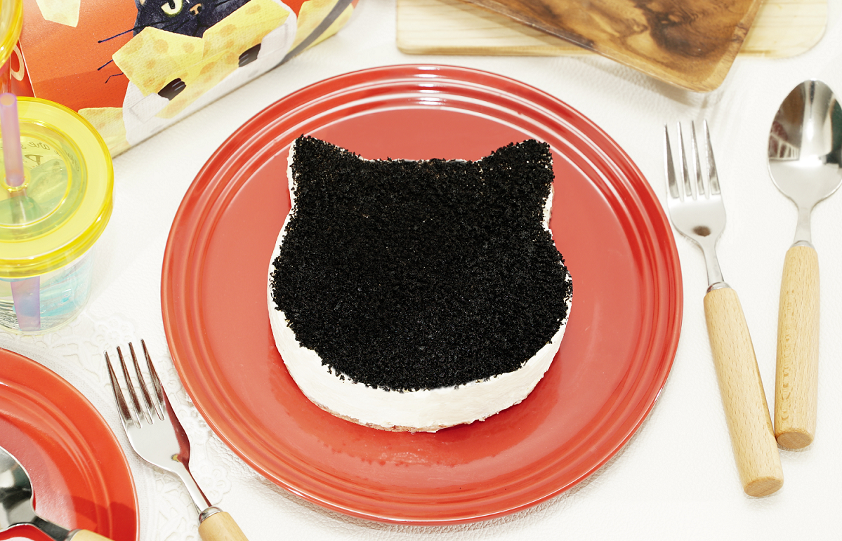 クロネコの顔をそのままかたどった様な見た目がかわいい商品。ブラックココアクッキーと甘酸っぱいイチゴのクッキーを使用したチーズケーキです。直径約12cmで、家族やカップル、友人とシェアして食べるのがオススメです。