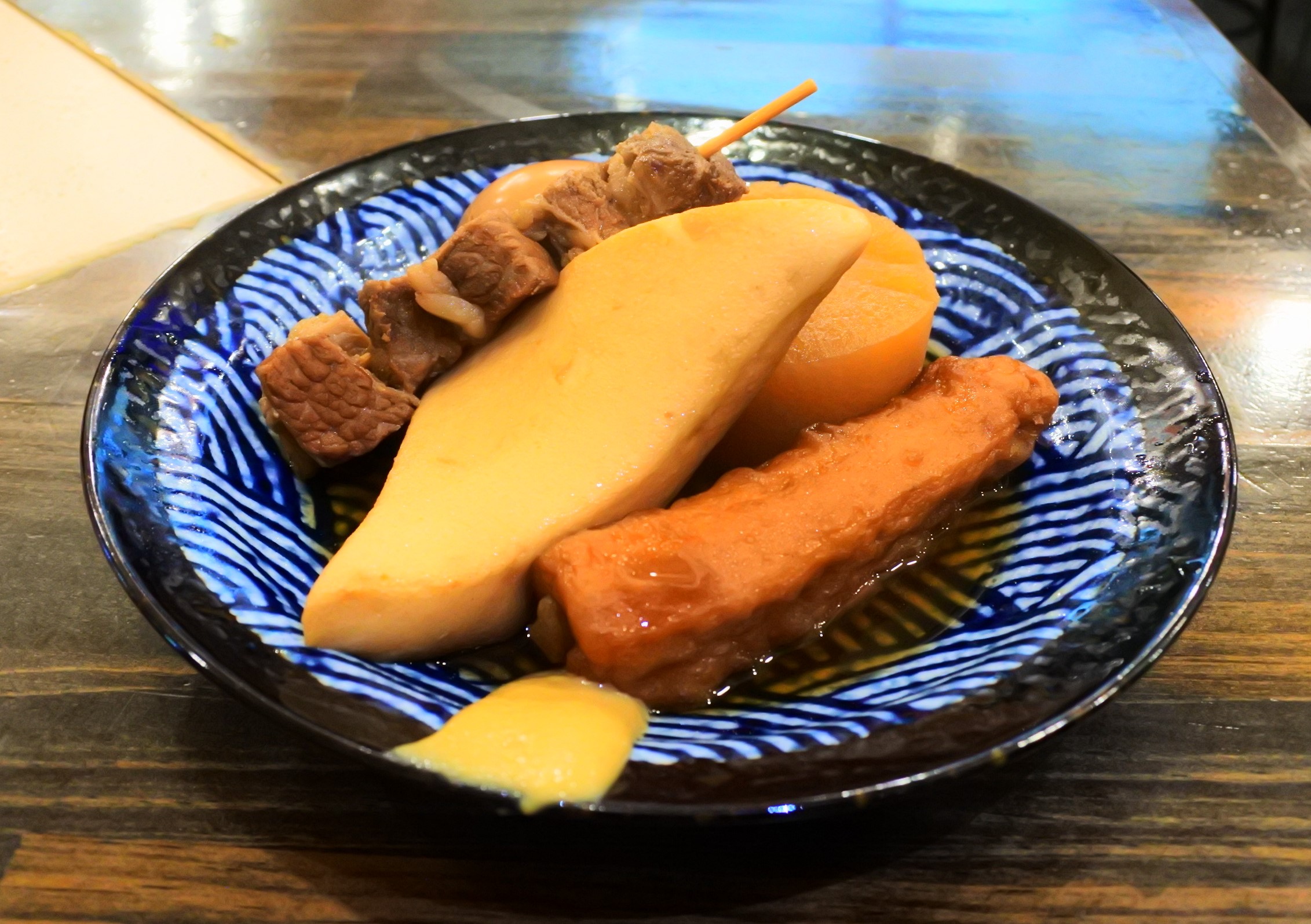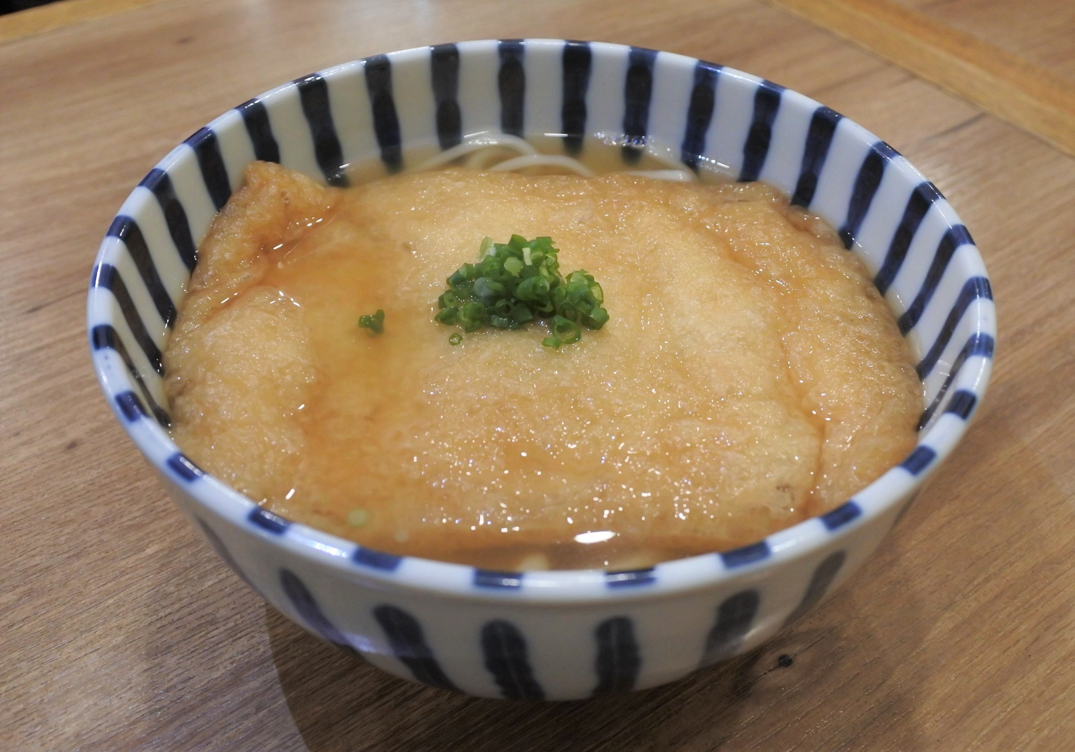 提供するフードメニューは約80種類。おでんや鶏肝煮など、自慢の出汁(0円)を使ったメニューを多数そろえており、店名にもある、けつね(きつね)のうどん「名物けつね」(605円)や、丼物の上部分だけを楽しめる「あたま」メニューなどを名物に展開します。
