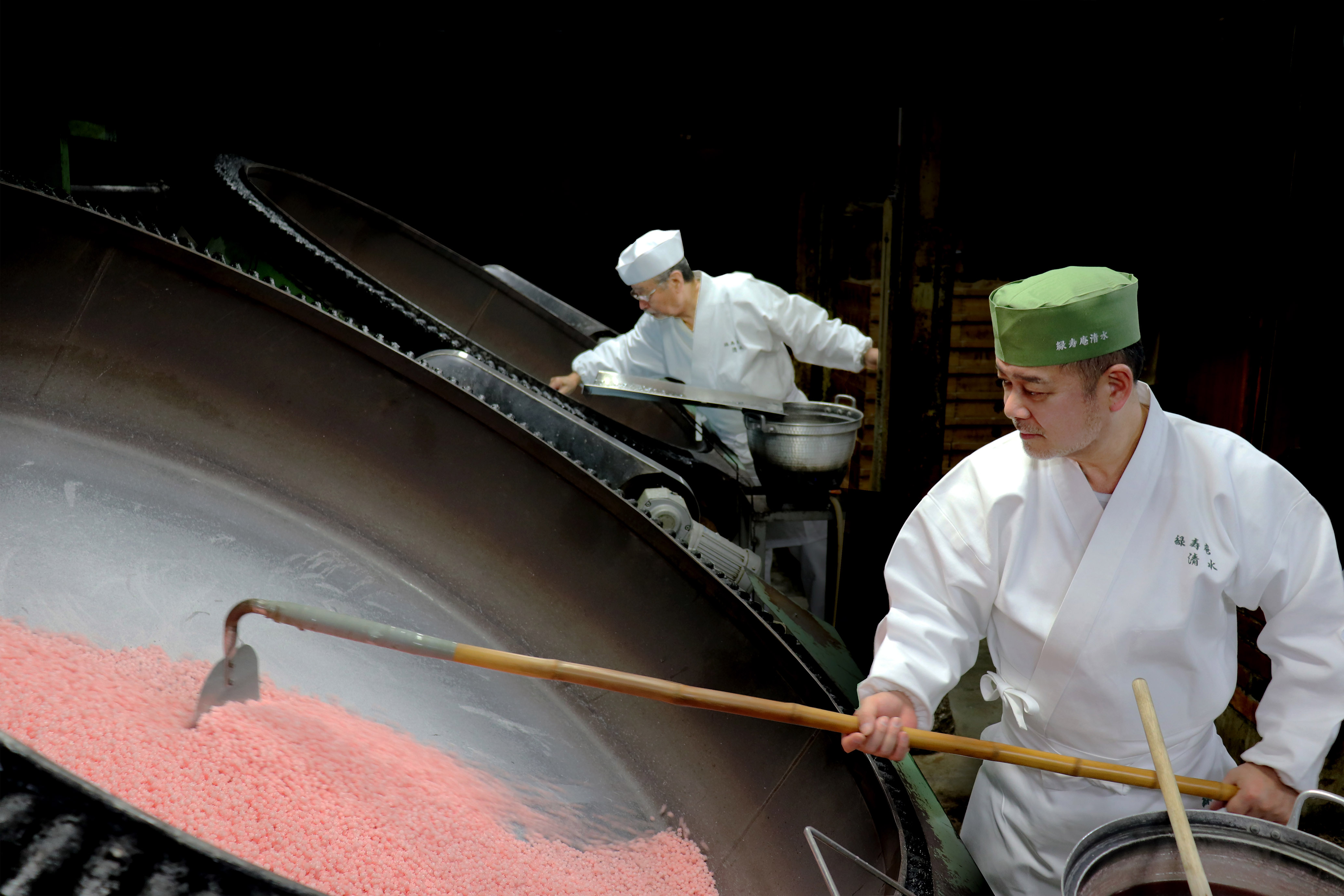 緑寿庵清水の金平糖にはレシピがなく、その時々の天候・湿温などにより変化する状態を見極め、金平糖が釜の中で流れる音を聞き分けたり、コテ入れの感触など五感を研ぎ澄ませながら蜜の濃度や釜の角度、回転速度などを調節し、星形に育て上げます。