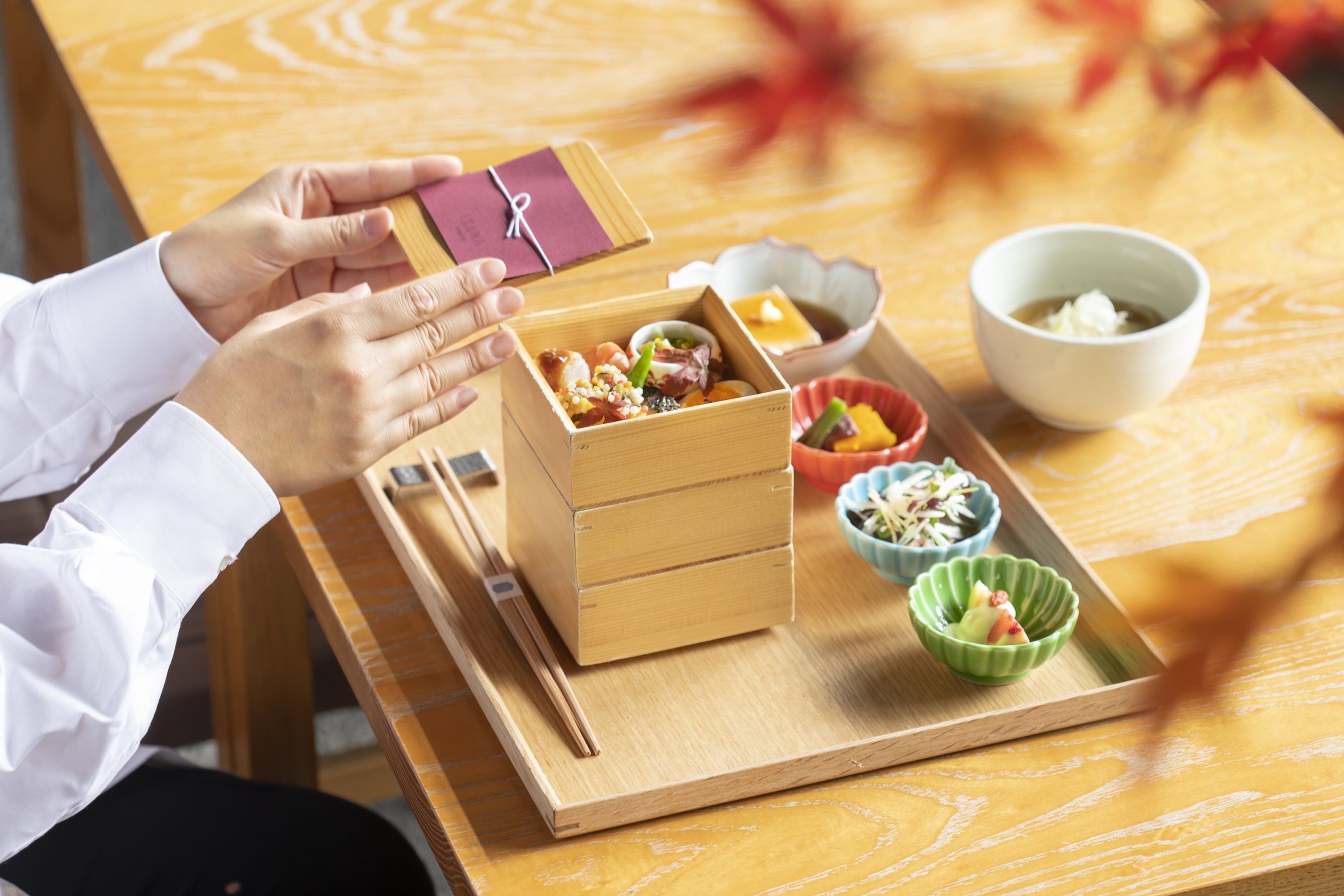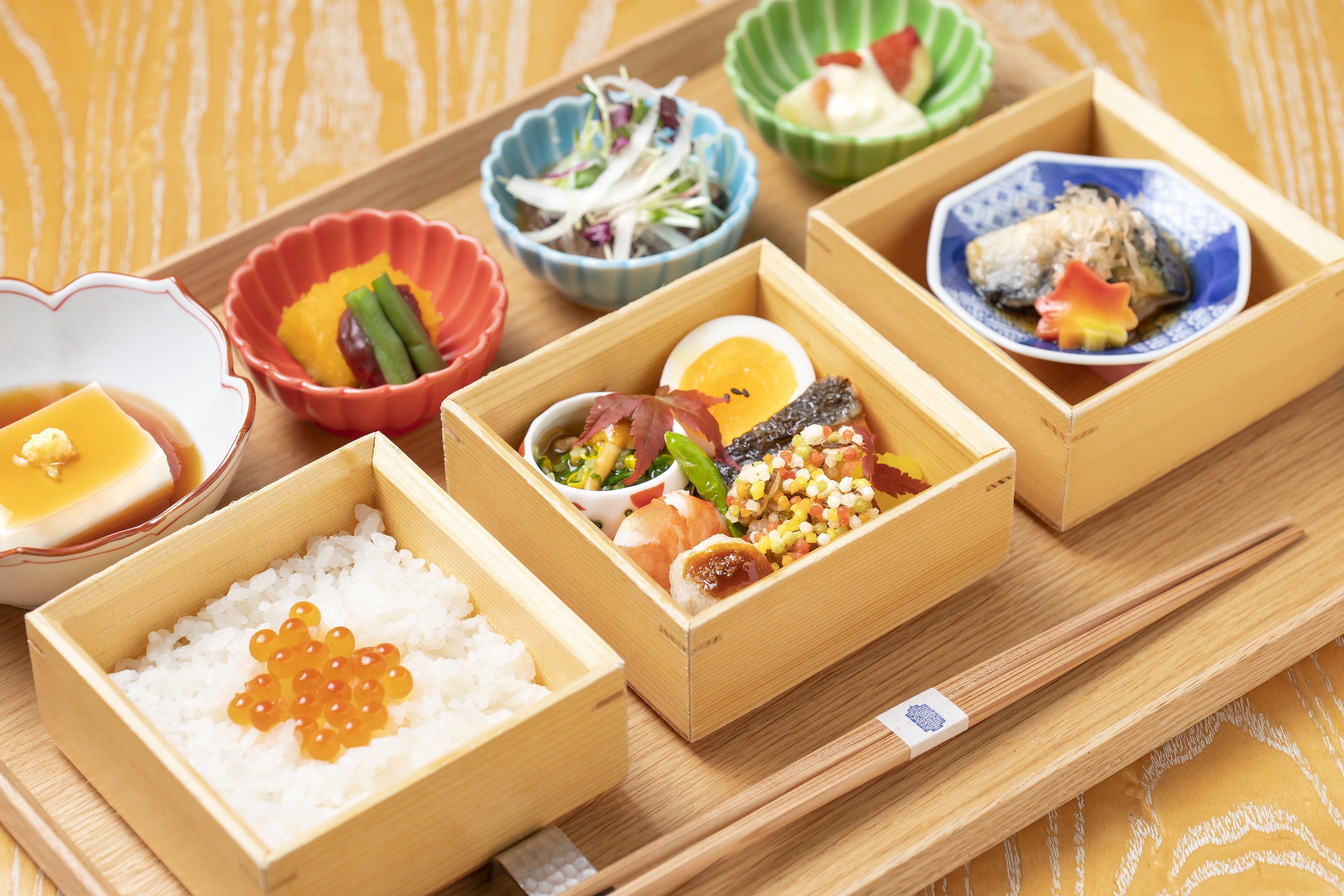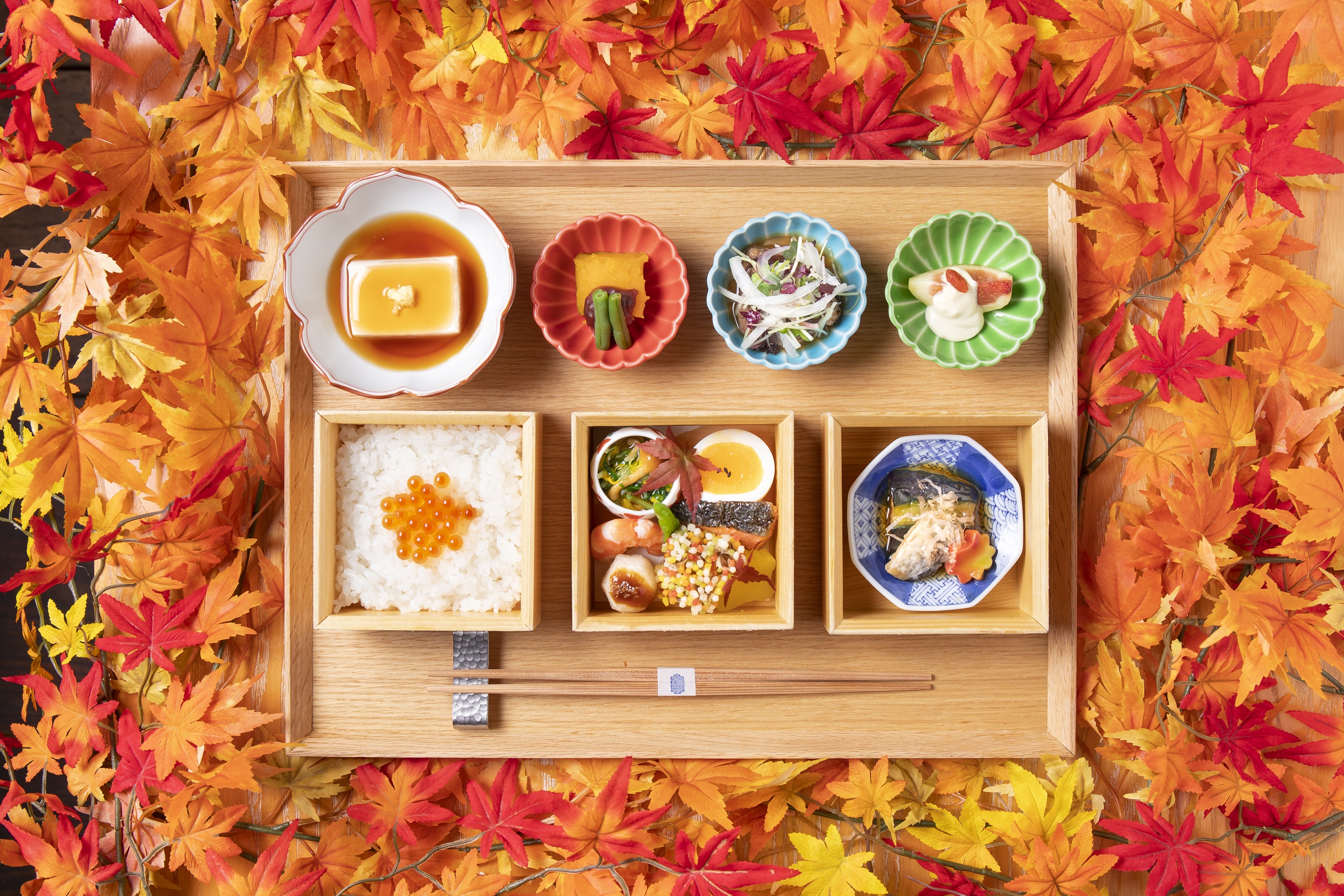 一ノ重には、イチョウの形を模したさつまいもの”公孫樹丸十レモン煮 ”、華やかな色どりが目を引く”舞茸のあられ揚げ”、シンプルな味付けでさっぱりといただける”水菜となめこと菊花のお浸し”など、秋を満喫できるメニューを中心に彩ります。二ノ重には、とろけるなすにお出汁が染み込んだ秋茄子の煮浸しに、秋を感じる秋刀魚の唐揚げを添えた”秋茄子と秋刀魚唐揚げ”。三ノ重には、ぷちぷちとした食感と濃厚な味わいが魅力の旬のいくらで飾った”いくらご飯”を。