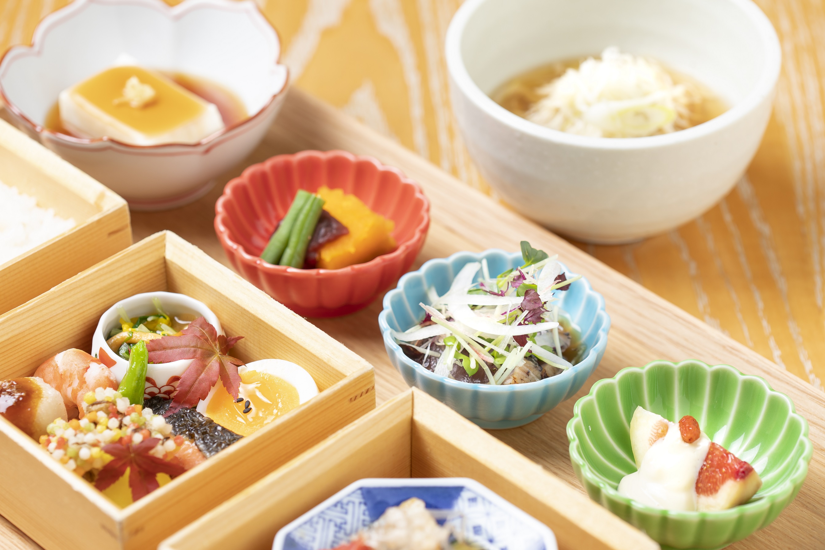 今年の「秋のおばんざい御膳」は、秋の行楽弁当をテーマに京都の緑が紅葉へと移り変わる秋の気配を感じられる特別仕様でご用意。小さな三段のお重の中には、旬の食材を使用したおばんざいをぎゅっと詰めました。