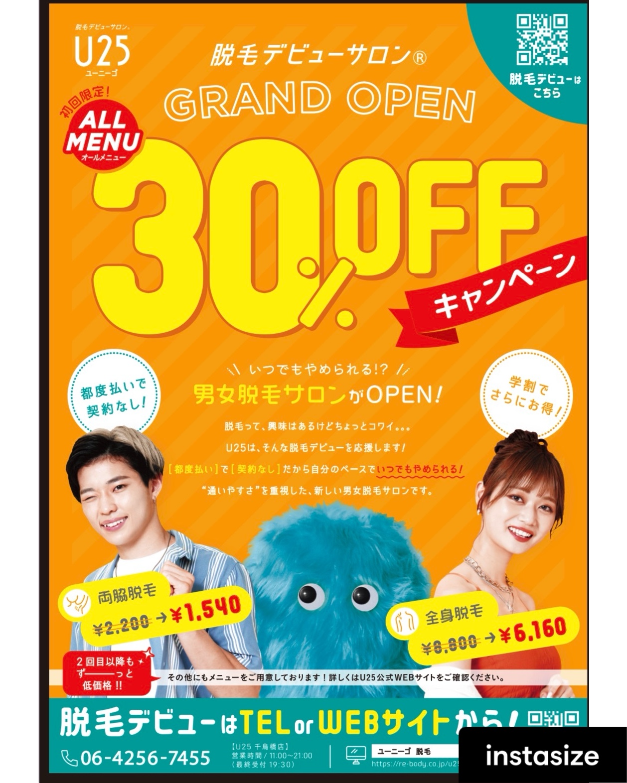 美容室サロン・エステサロン向けに、美容機器・教育セミナー・サロンノウハウ・集客プロモーションを提供する株式会社リボディ(本社:大阪府大阪市、代表取締役:梶原美佳)は、2021年7月26日(月)、学生を中心とする若い世代に特化した脱毛サロン「U25(ユーニーゴ)」を大阪市内に2店舗オープンしました。両脇脱毛は1500円(税込)から、全身脱毛は5800円(税込)からと、リーズナブルかつ都度払いの施術を提供いたします。