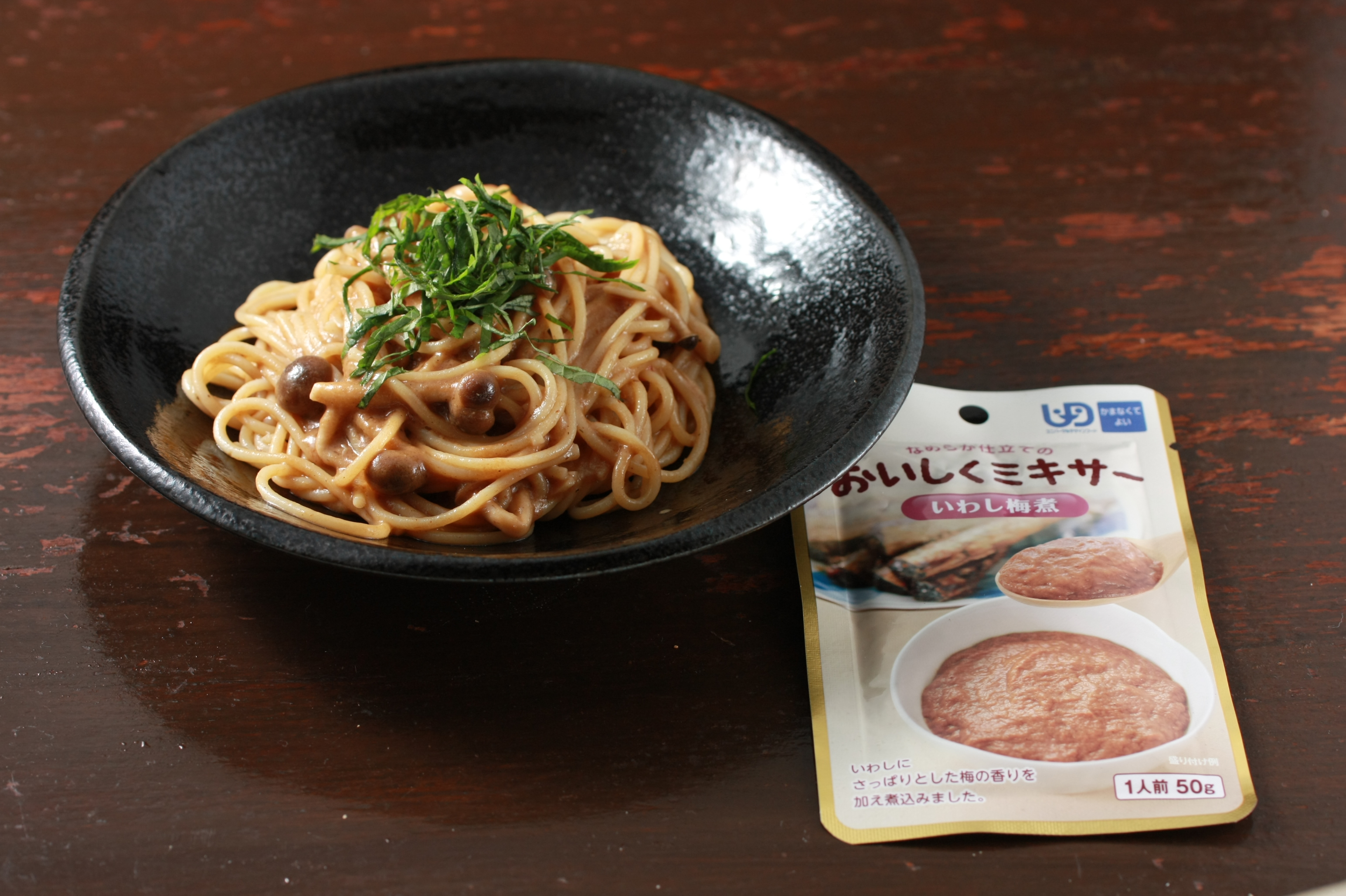 茹でたパスタと、しめじとからめ、刻んだ大葉を乗せて完成