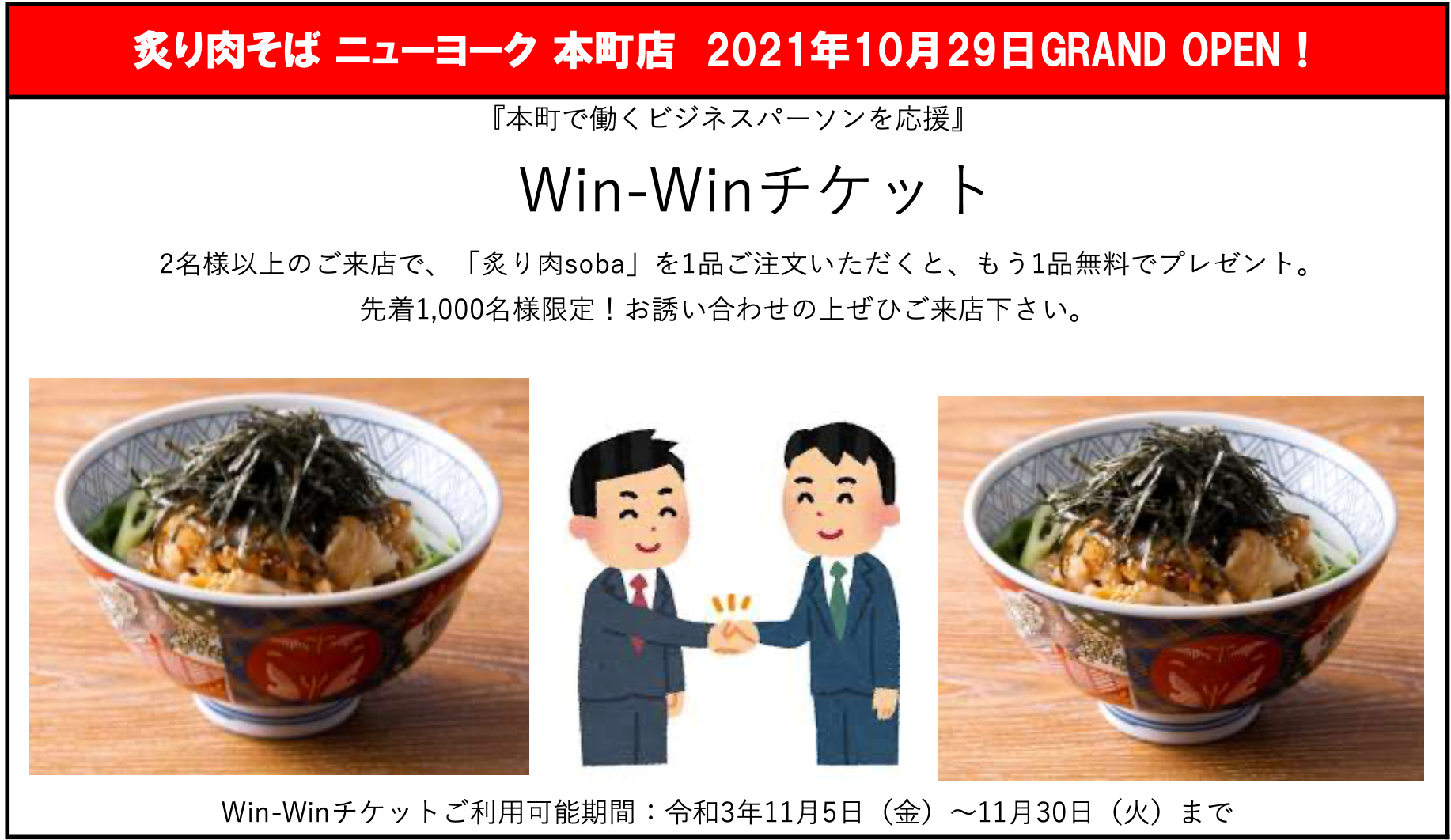 内 容:2名様以上のご来店で「炙り肉soba」を1品ご注文いただくと、もう1品無料でプレゼント
