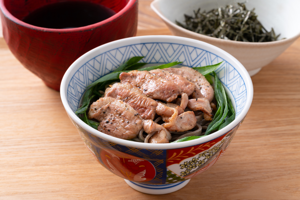 ■特注の極太そばに炙った豚肉をどっさり乗せた肉そばでシズル感を演出。