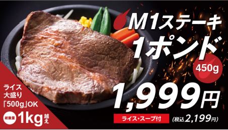 ランチタイムは、 1000円台の価格帯でごはん・スープ付きのお得なセットでご提供。ステーキとご飯・スープの基本セットが税抜999円(税込1098円)から。ごはんは大盛が500gまで可能。1ポンド約450gのM-1ステーキのセット税抜1,999円(税込2,199円)を頼むと、なんと総重量は1㎏超になります。さらに、当店でランチセットご注文を頂いたお客様にはもれなく、黒烏龍茶飲み放題サービスがついてきます。
