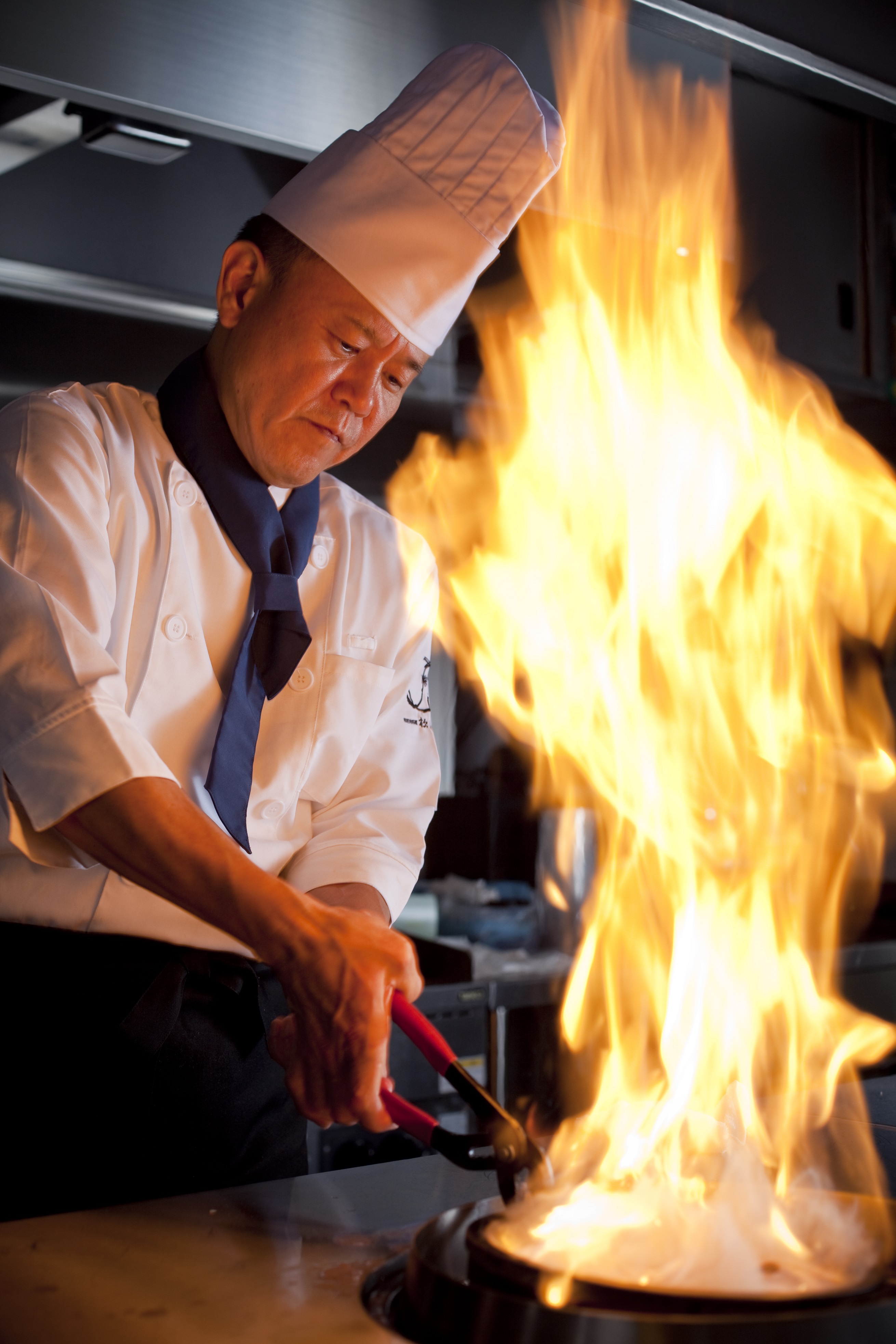 お客様通路に面した、焼き場では、常にステーキが焼かれる様子がご覧頂ける。1mを超えるフランベの炎が上がる姿は圧巻。