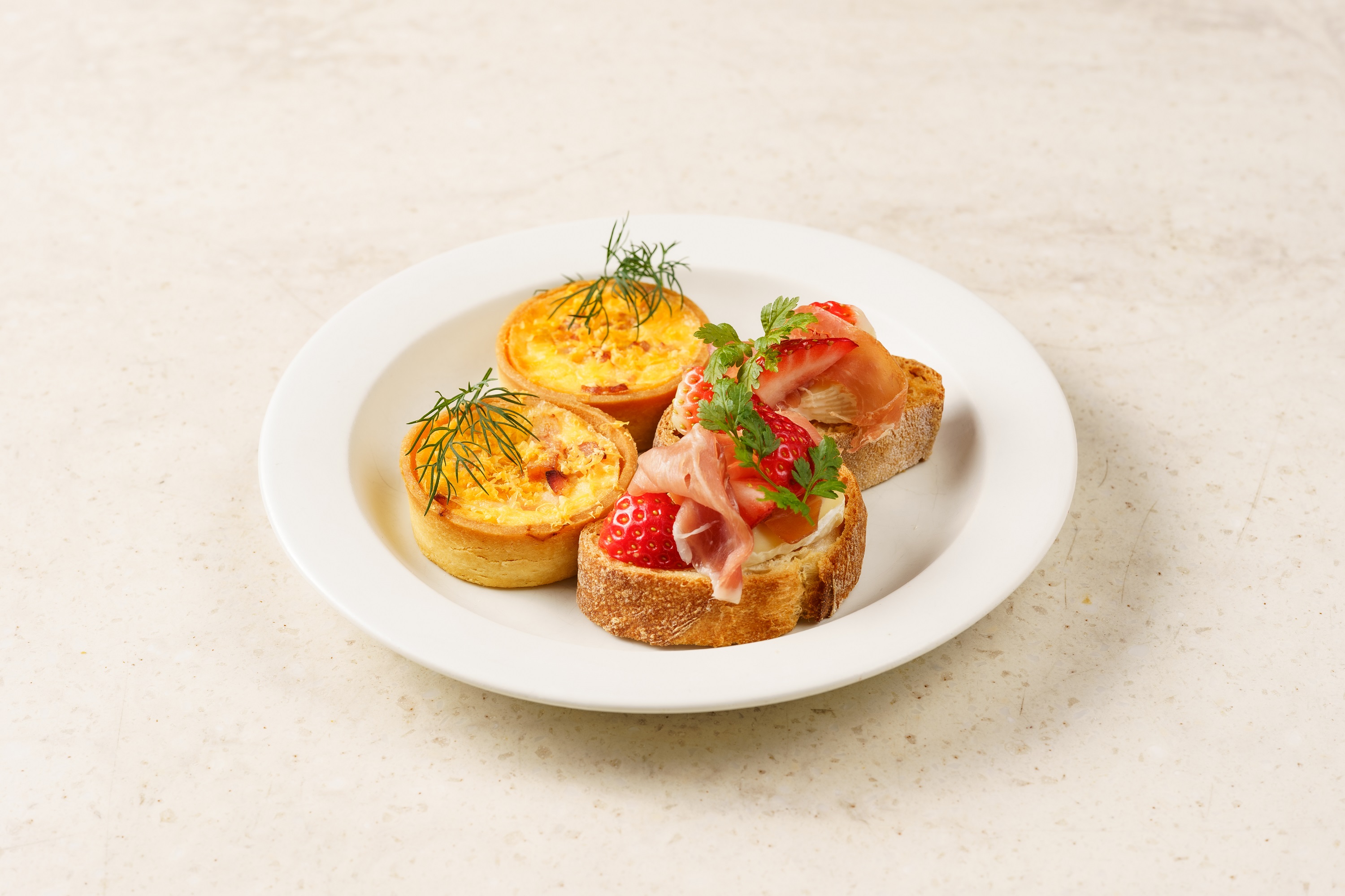 3段目には、しっかり焼き上げたバゲットにいちごの優しい甘さとカマンベール、生ハムがよく合う 「カマンベール、生ハム、苺のオープンサンド」、タルト生地にベーコンと玉ねぎ、卵液を流して焼き上げた「ベーコンと玉ねぎのキッシュ」。こちらはお食事としてもお楽しみいただける一品です。