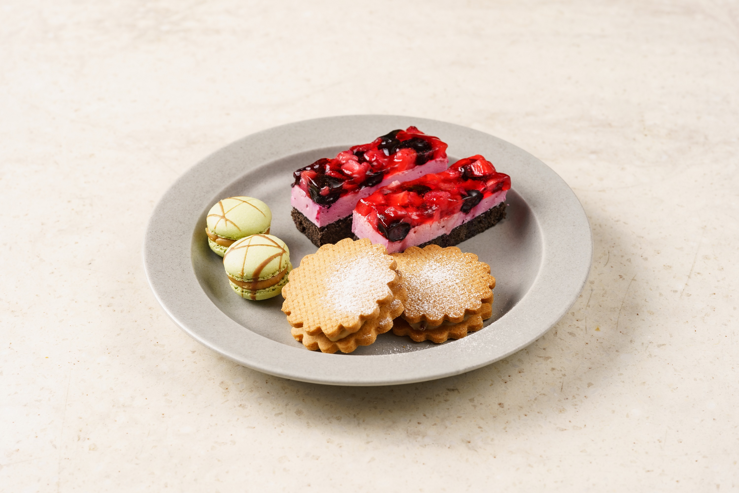 2段目には、ベリーをふんだんに飾った甘酸っぱい「ベリームース」、アールグレイが香る一口サイズの「マカロンアールグレイ」、スパイスとドライフルーツを混ぜ込んだバターサンドクッキーでクリスマスの定番菓子・シュトーレンをイメージした「シュトーレン風バターサンド」。
