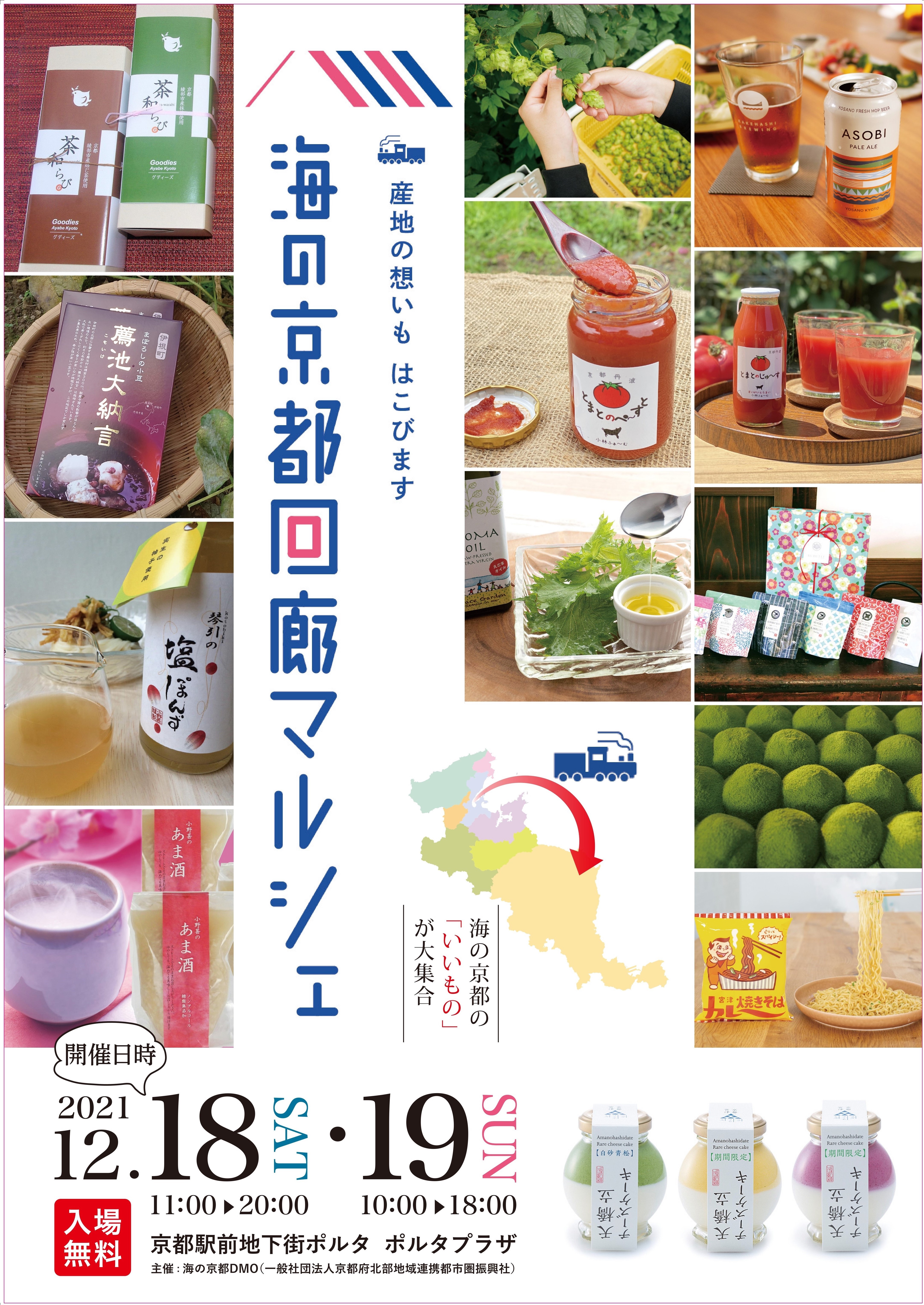 京都府および府北部7市町で構成する一般社団法人京都府北部地域連携都市圏振興社(海の京都DMO)は12月18日(土)・19日(日)の2日間、京都府北部の魅力あふれる特産品を集めた「海の京都回廊マルシェ ~産地の想いも はこびます~」を、西日本旅客鉄道株式会社と連携し、貨客混載事業の実現に向けた実証実験をかねて京都駅前地下街ポルタで開催いたします。ぜひ、海の京都DMOエリアの魅力を体感しにご来場ください。