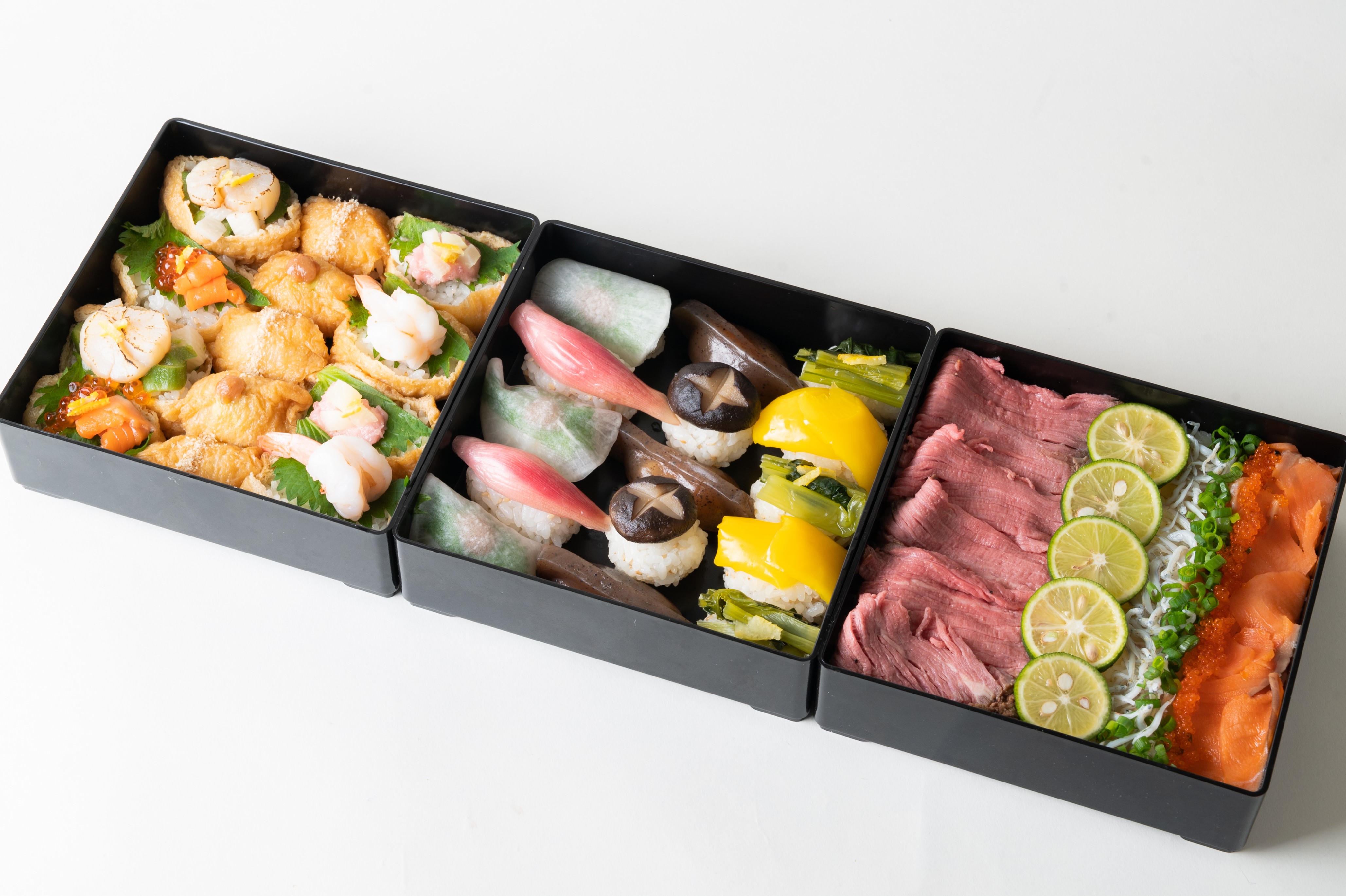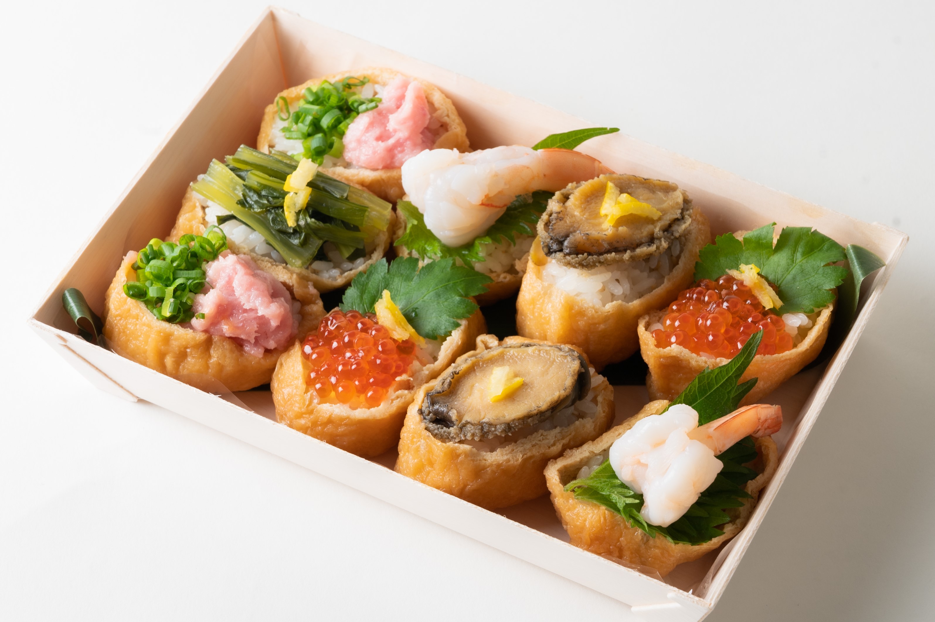 百貨店らしいぜいたくなメニューもご用意しました。キャビアやウニ、フォアグラなどを使った”日本一高いいなり寿司”(4個・4,104円)のほか、年末年始の食卓を彩る「むろやの三段重」(7,992円)などプチぜいたくをお楽しみいただけます。