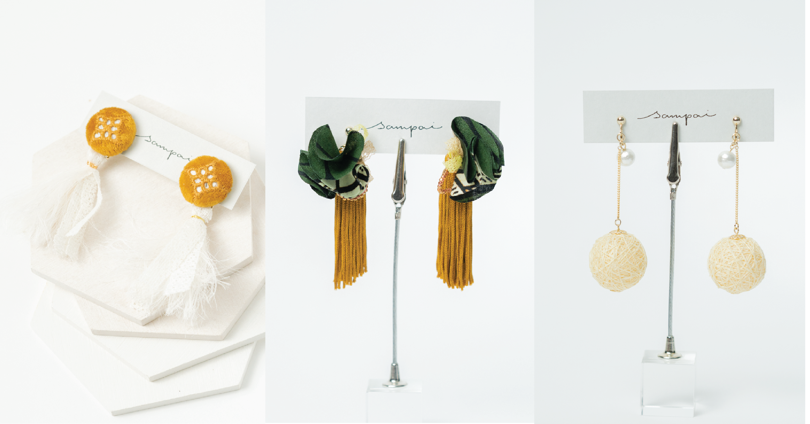 sampaiは2021年6月にアクセサリーブランドとして販売をスタート。伝統文化の保全、素材を余すことなく使うサスティナビリティの観点から、京都・西陣の伝統/地域産業から出る産業廃棄物(産廃素材)を利用したアクセサリーを製作。京都、大阪、東京等でイベント出店を行い、ユーザーの声を取り入れた作品製作を行なってきました。