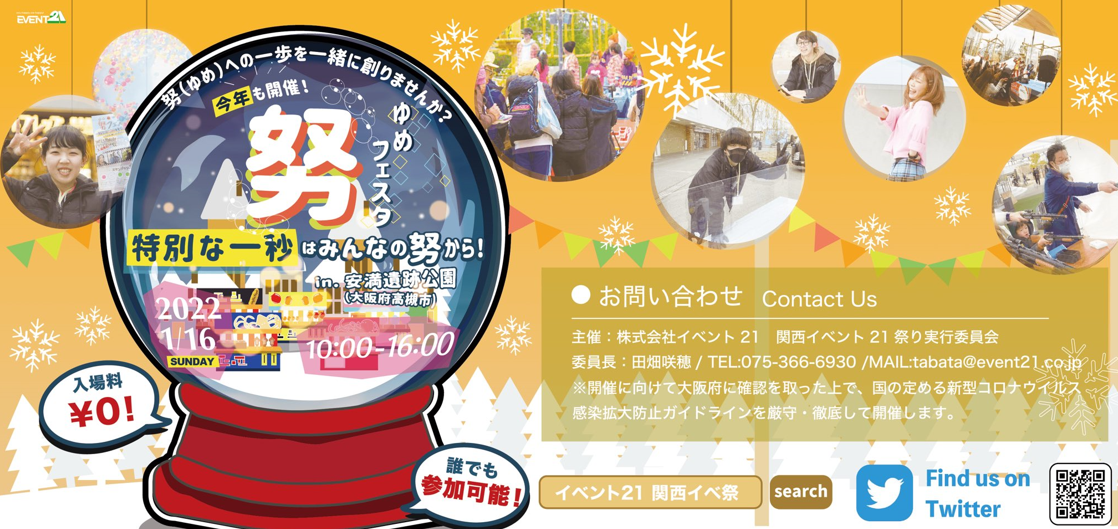 株式会社イベント21(奈良県香芝市 代表取締役社長 中野愛一郎、以下イベント21)は、2022年1月16日に大阪・高槻市の安満遺跡公園にて第8回関西イベント21祭り「努(ゆめ)フェスタ~特別な一秒はみんなの努(ゆめ)から!~」を開催いたします。