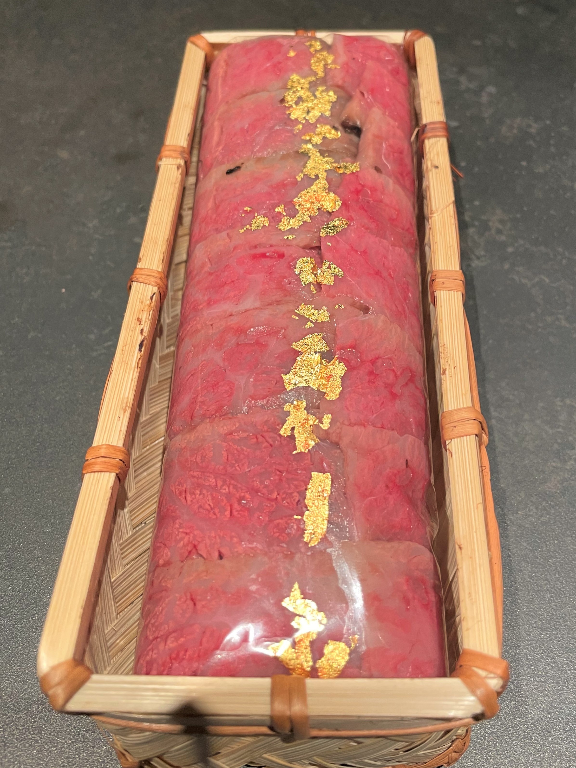 今年も、黒毛和牛シャトーブリアンのビフカツ(約250グラム)を入れ、海苔の代わりに黒毛和牛いちぼのローストビーフ(約100グラム)で巻き、1本に付き黒毛和牛約350グラムを使った豪華な恵方巻きをご用意いたしました。
