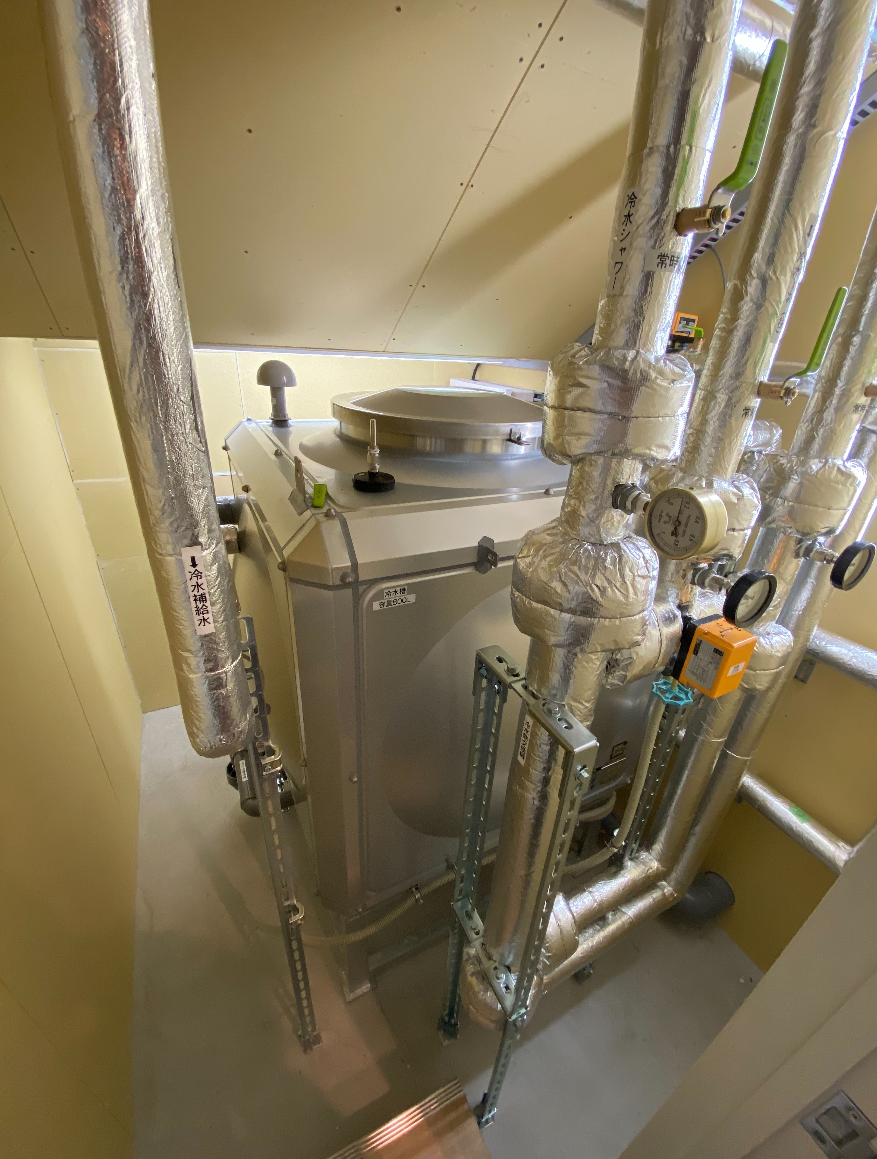 シャワー室には通常のシャワーとは別に、頭上に400口径のシャワーを設置。容量1トンの貯水槽を施設内に置き、専用のシステムで管理して常に15℃の冷水を安定供給します。サウナといえば「水風呂」が注目されていますが、当店ではあえて「水シャワー」をご用意。さまざまなサウナを体験・研究し通常の水風呂より少し冷たい「15℃」という適正温度を導き出しました。