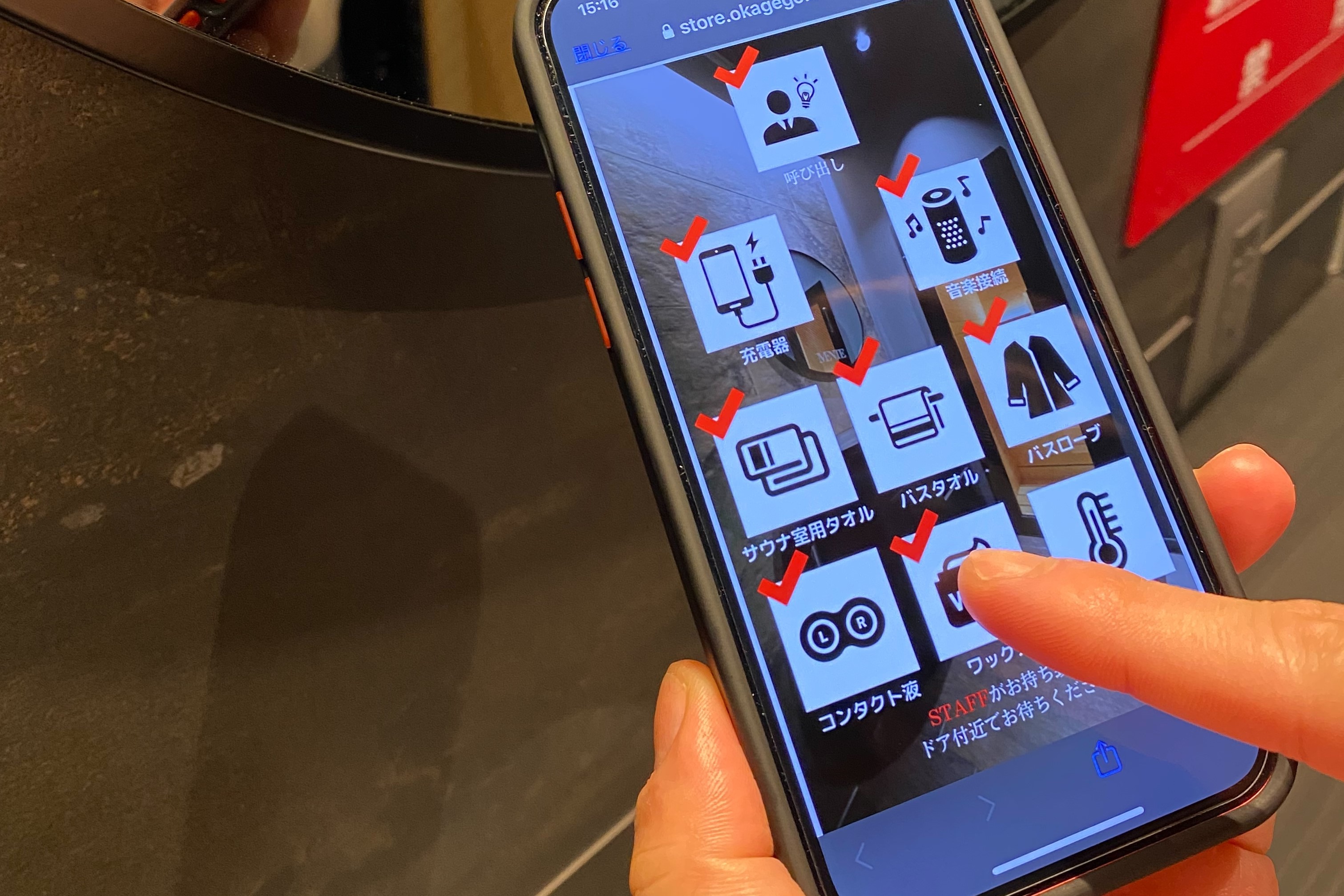 シャンプー、リンス、タオルなどのアメニティは標準でご用意しているほか、身だしなみを整えるワックスやスプレー、喉の渇きを癒すドリンクの注文などはモバイルオーダーに対応しています。入口から出口までを一方通行とすることで人との接触を避けた導線作りも意識しました。