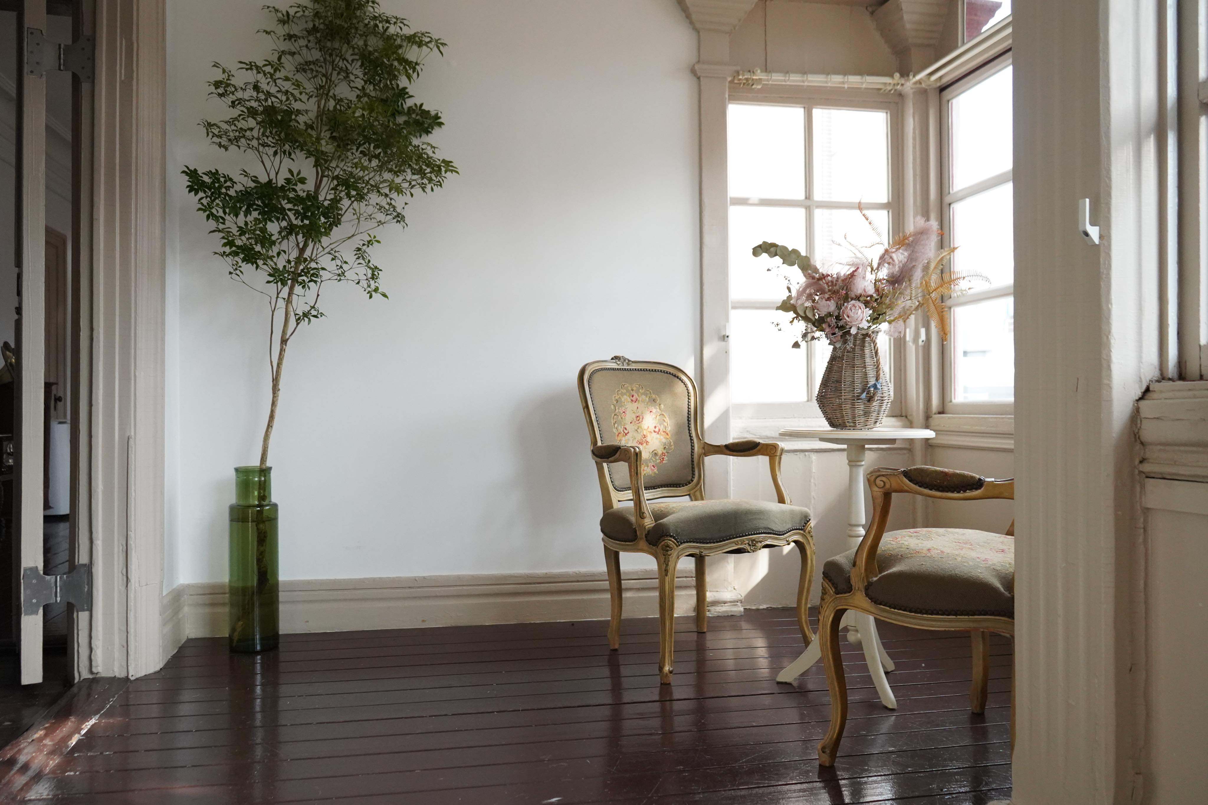 家具や内装は、学生や若手クリエイターが集まってプロデュース。地元企業の協力で、歴史的な文化遺産に添うアンティーク&本質感あふれる仕様に。白い漆喰壁は清潔感があり、丁寧に歳を重ねた木の床は心地よく軋み、サンルームには温かい陽光が射します。世界観を最大限に活かすため、アール・デコ調の家具や西洋のオイルランプ、古いレコードやステンドグラスで飾っています。さらに英国土壌協会の認定を受けたオーガニックアロマによる空間の香りにもこだわり、樹齢120年のソテツの木がシンボルの約100m2の庭もライトアップし、ガーデンテラスにするなど、撮影場所としても唯一無二のロケーションに仕上げました。