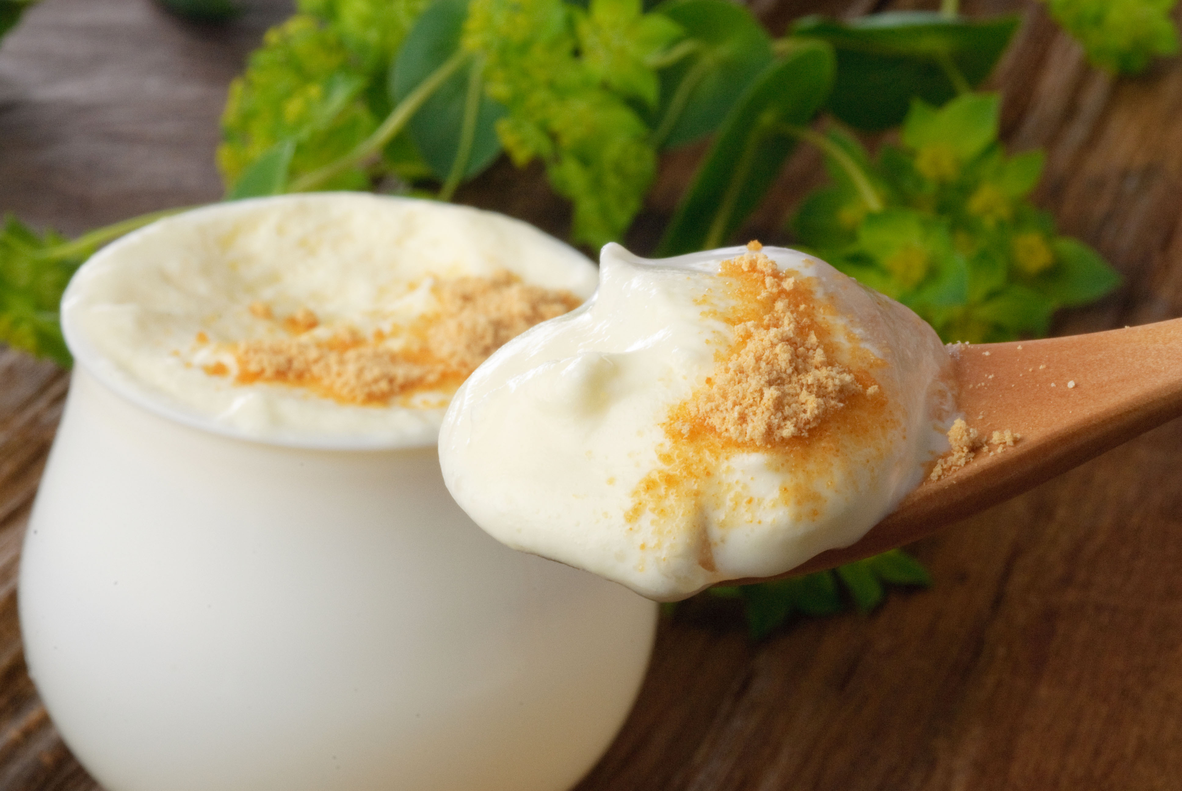 とろとろ状態のわらび餅の美味しさに気づき、商品開発に着手。何百回と配合を調整し続けようやく、とろとろの配合を導き出し、商品化に至った「とろとろわらび餅」。割り箸でないと掴めないほどとろとろの食感で、あずきが練りこまれているわらび餅に、色も香りも濃いきな粉がたっぷりかかっているのが特徴です。