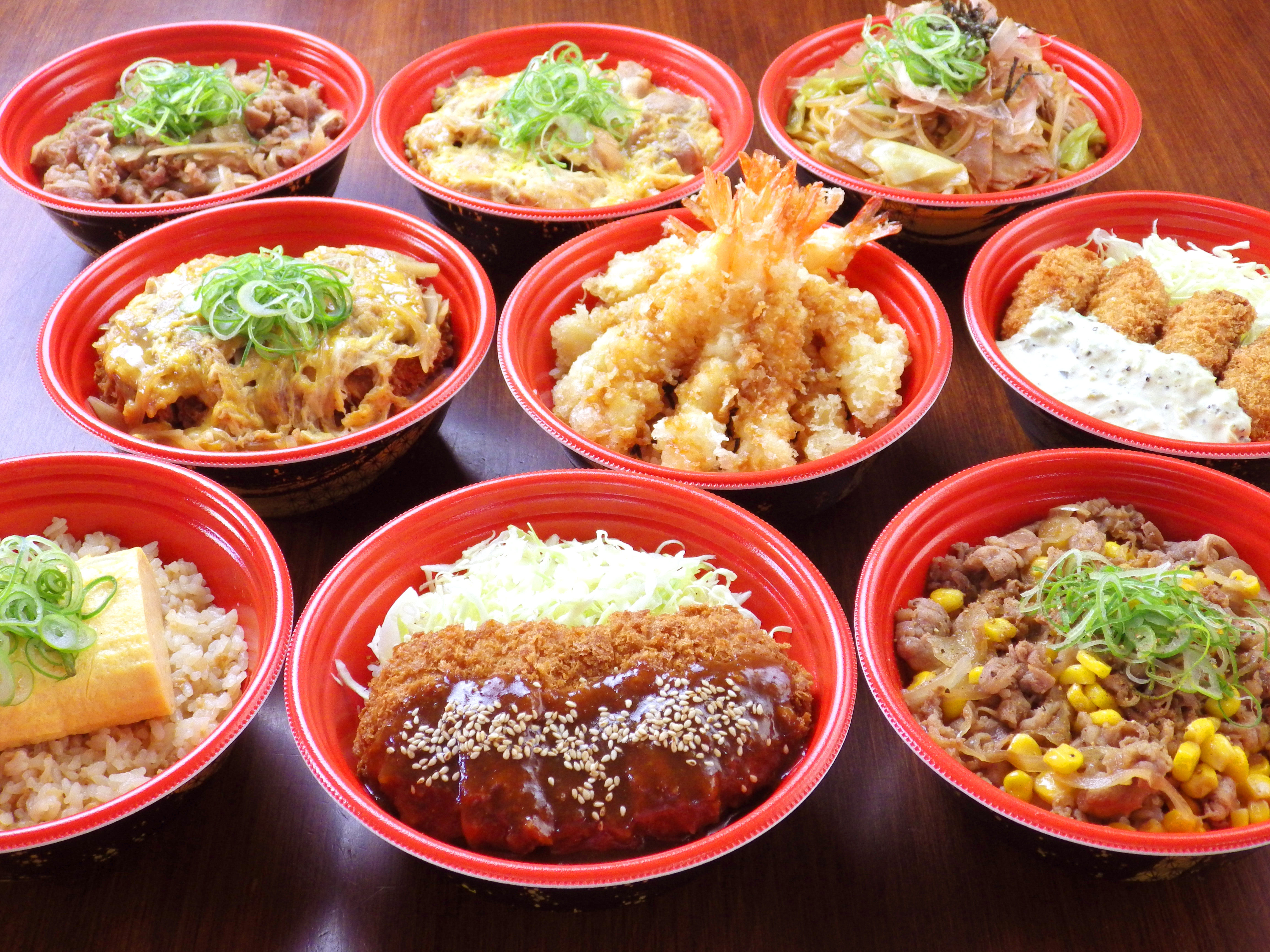内 容:牛丼、親子丼、焼きそば丼など9種をご用意