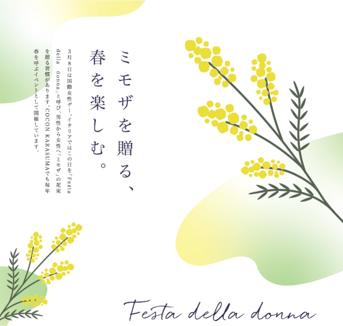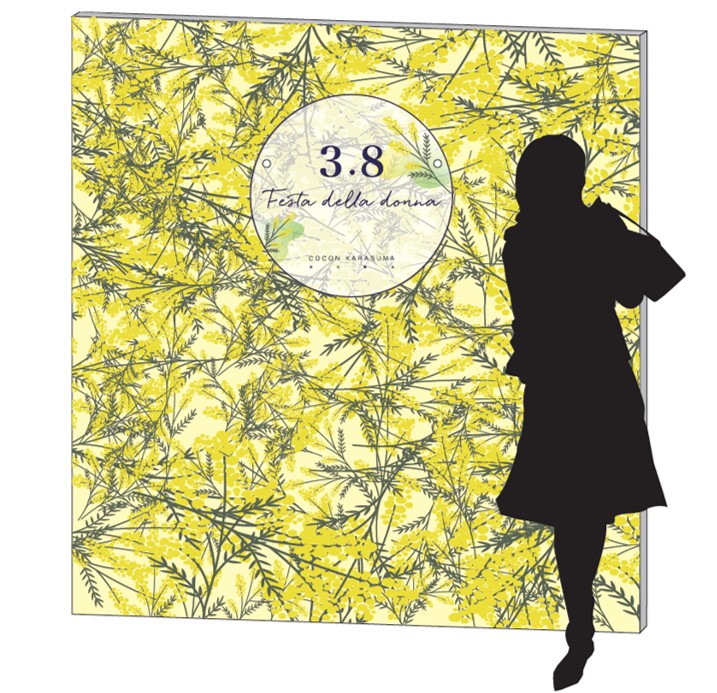 イタリアの女性へ「ミモザ」の花束を贈る習慣にちなんで、館内ではミモザで作られたフォトブースが登場!ミモザのミニブーケプレゼントも行います。
