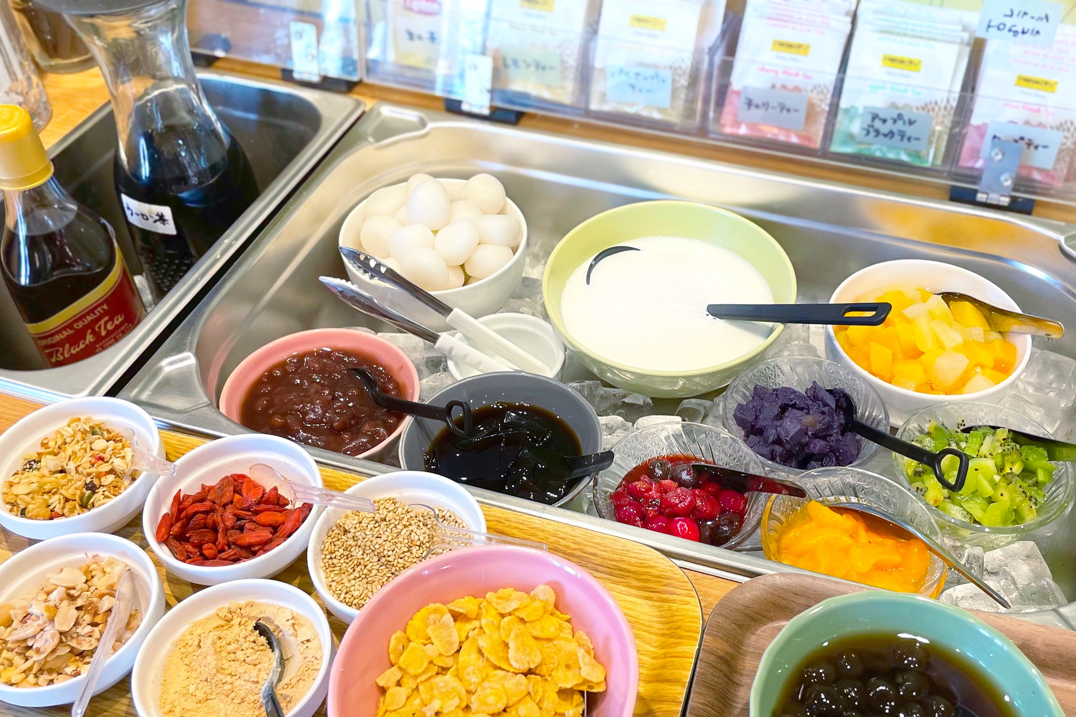 こちらも奈良にはなかったベトナムスイーツ「チェー」のバイキングです。季節の果物や、白玉・あずきなどにココナッツミルクをかけて自由にカスタマイズ出来る楽しいデザートです。