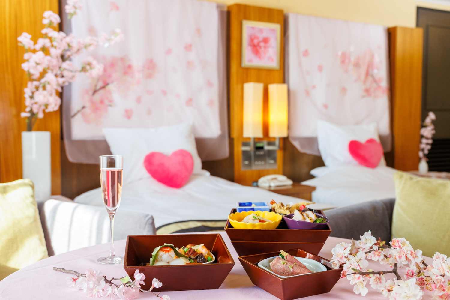 近場のホテルで、桜づくしのプランをお楽しみ下さい。限定桜ルームに温泉入り放題、館内の謎解きプランにトライ!お食事には桜スパークリングワインをプレゼント、お部屋でまったりされたい方にはルームサービス桜アフタヌーンティーと桜行楽弁当もオーダー可能!