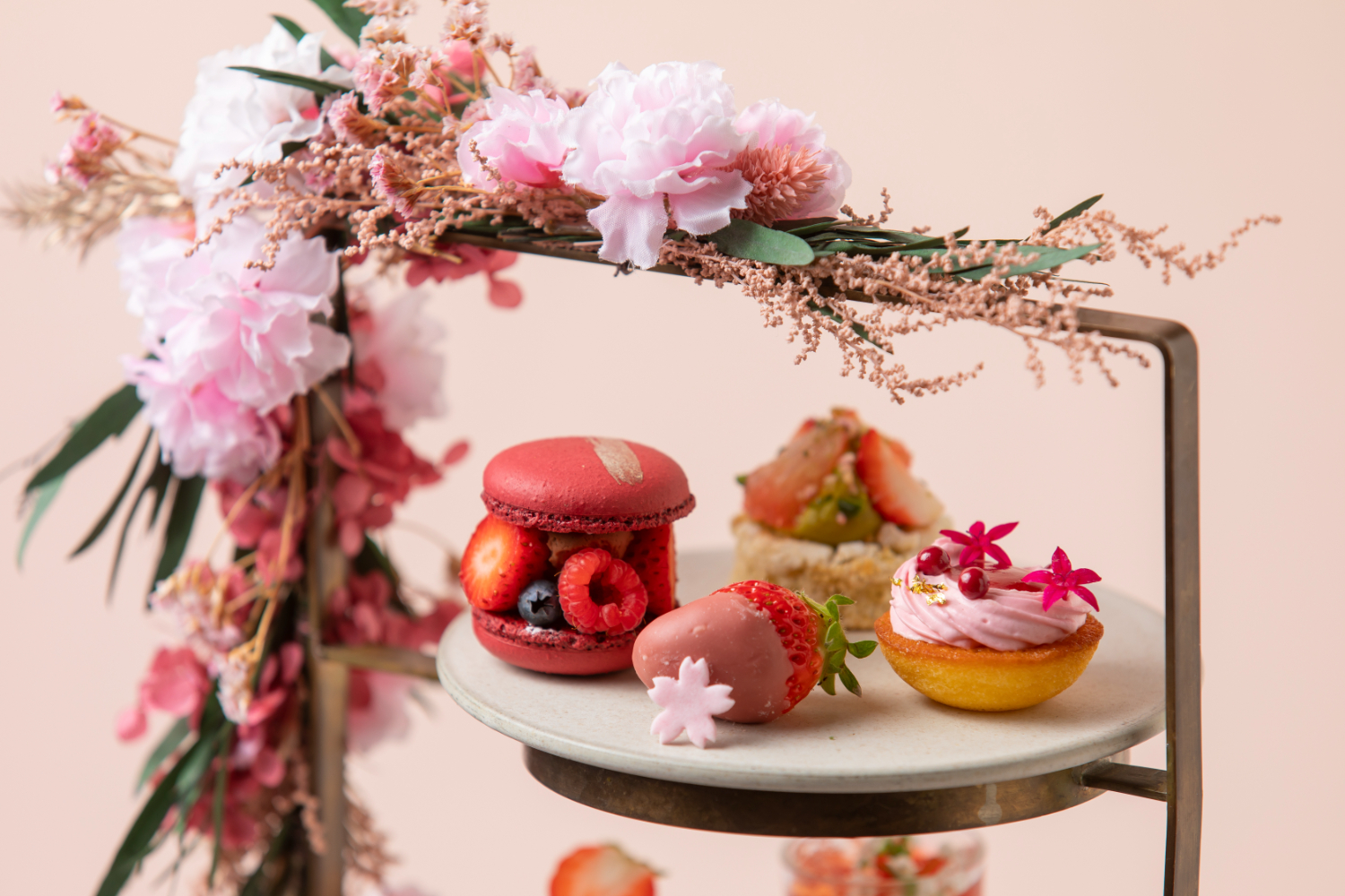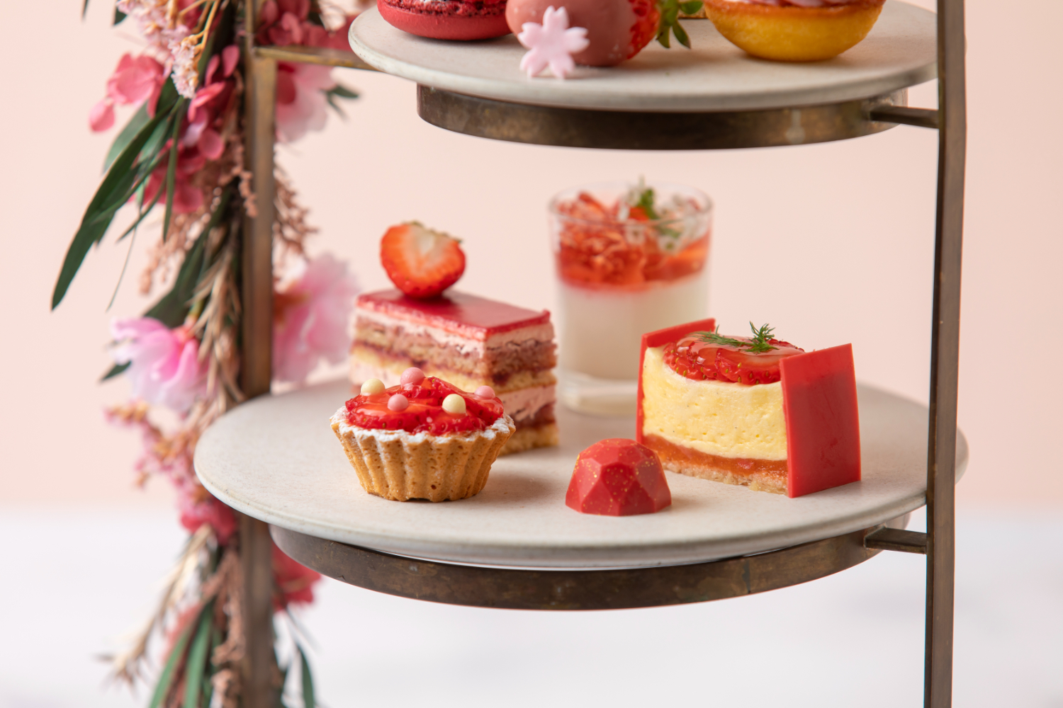 上段には、数種類のベリーとチョコレートガナッシュを合わせた「ベリー&チョコレートマカロン」、いちごとピスタチオの酸味と濃厚な味わいのハーモニーが絶妙な「有機いちごとピスタチオのダックワーズ」、春を思わせるピンクのいちごクリームをあしらった「ストロベリー&ホワイトチョコブラウニー」、フレッシュの有機いちごをルビーチョコレートでコーティングしさくらの花びらをトッピングしたフレッシュな「有機いちご」。