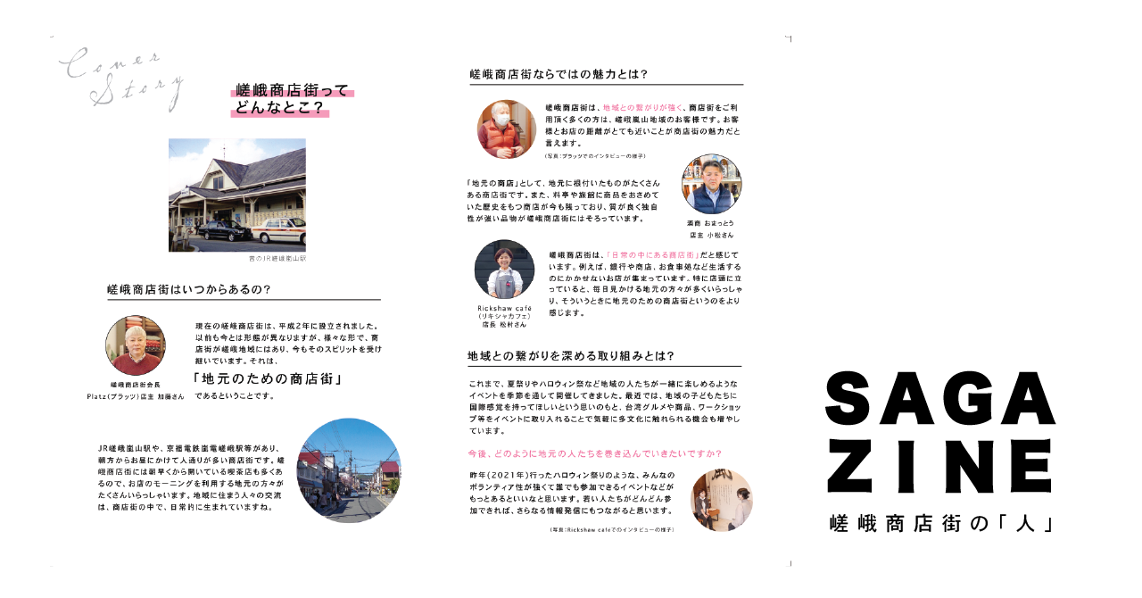 【SAGA ZINE】では、地域住民が嵯峨商店街の店舗やサービスについて知ってもらう機会を提供することを目的として、新規で嵯峨商店街に加入した店舗、また既存店舗を合わせて12軒を紹介。加えて、「商店街」とはどういう場所なのかという疑問に、商店街で店舗を営む嵯峨商店街会長 Platz の加藤様、他3名にインタビュー記事を実施した記事を掲載。コミュニティ広報誌と観光雑誌の両方の性質を兼ね備えた、嵯峨商店街の魅力を届ける内容になっています。