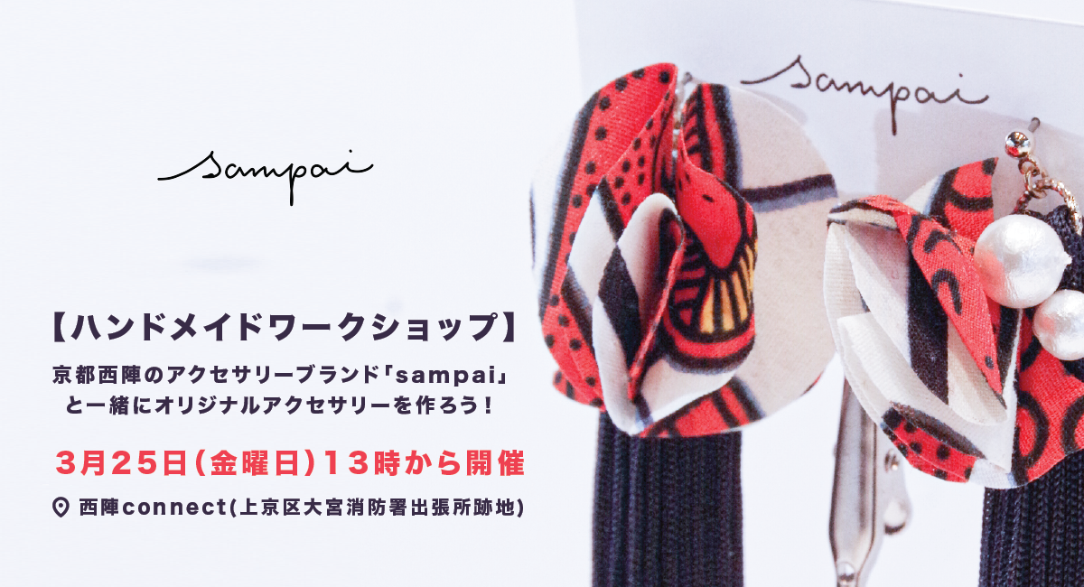 京都西陣を拠点に伝統・地域産業と協力し、産廃を活用したアップサイクルのハンドメイドアクセサリーを製作する「sampai(さんぱい)」(運営:頼-tano- 代表:宮武愛海) は、3月25日(金)に初のハンドメイドワークショップを開催する。参加人数を5名に限定し、産廃素材を使用したハンドメイド商品を参加者と共に製作する。プロダクトデザイナー手束が指導を担当し、作った作品は持って帰ることができる。参加を通して、産廃素材の再利用方法を体験してもらい、形を変えて使い続けるという日本古来の文化を身近に捉えてもらう取り組みである。