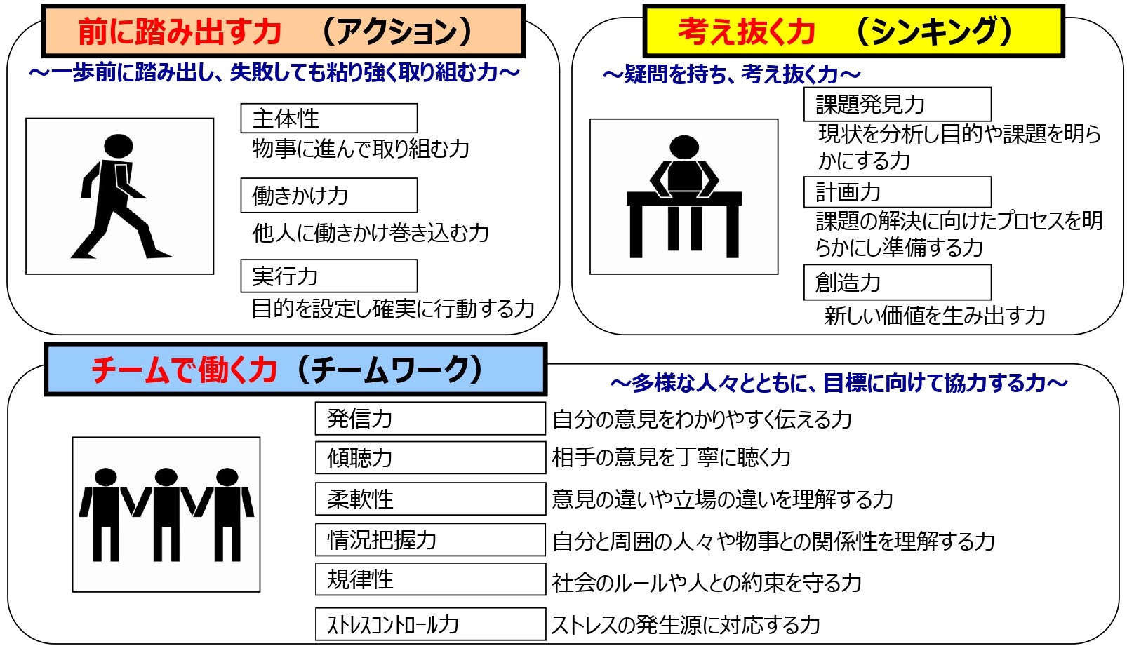 ①経済産業省は2006年、職場や地域社会で多様な人々と仕事をしていくために必要な力を「社会人基礎力」として定義しました。「前に踏み出す力」「考え抜く力」「チームで働く力」の3つの能力と、それらに付随する12の能力要素で構成されます。政府は、人生100年時代において1つの企業で働き続ける終身雇用ではなく、本業以外の仕事を持つ「副業」、複数の仕事を平行して取り組む「パラレルキャリア」などの「働き方改革」を推し進めています。コロナ禍でテレワークやオンライン会議が定着し、主体的に目標を定め、コミュニケーションできる人とできない人の能力の差が顕在化しています。ライフステージの各段階で能力を発揮し活躍し続けるために、リカレント教育(社会人の学び直し)も推奨しています。スマートフォンで例えると、専門的なスキル(=アプリ)をアップデートするためにも、土台となる社会人基礎力(=OS)を身に付ける必要があります。