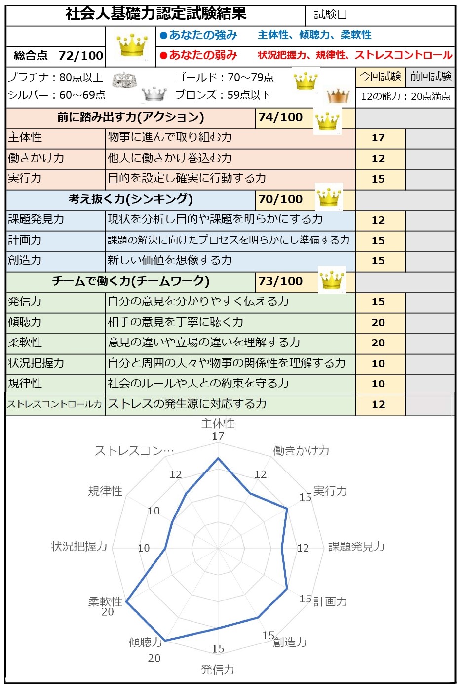 評価方法 : ①100点満点の総合評価 ②12の能力要素を多角形でグラフ化