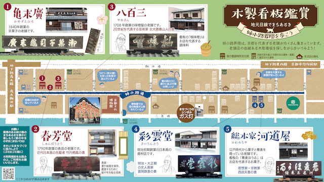 姉小路通りでは、姉小路界隈まちづくり協議会から提供いただいた情報をもとに、老舗店の木製看板を鑑賞しながら通りを歩く企画を掲載しています。旅行者が地元ならではの目線でまちあるきを楽しめるよう、地域と連携した情報発信にマップを活用していただいています。