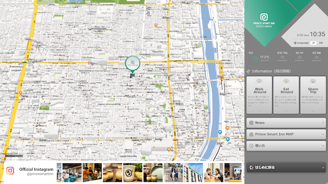 デジタルサイネージの導入支援や配信システムの開発を行う株式会社インセクト・マイクロエージェンシー(本社:東京都千代田区神田神保町 代表取締役社長:赤津直紀)は、2022年4月4日に開業した株式会社西武・プリンスホテルズワールドワイド(本社:東京都豊島区南池袋 代表取締役社長:小山正彦)が運営する「プリンス スマート イン 京都三条」に、自社開発のマップ型デジタルサイネージシステム「FLOWMAP4D」が導入されました。