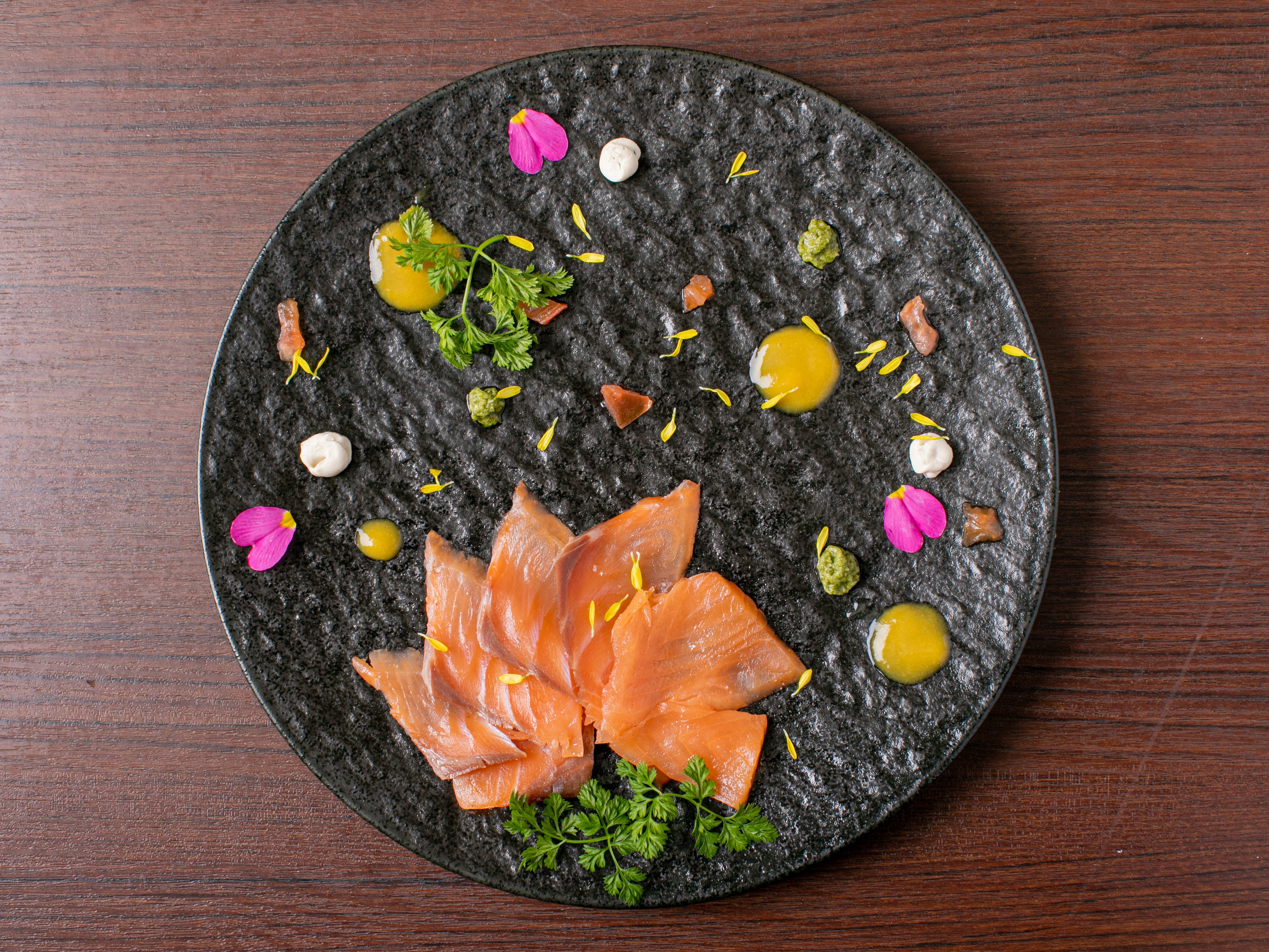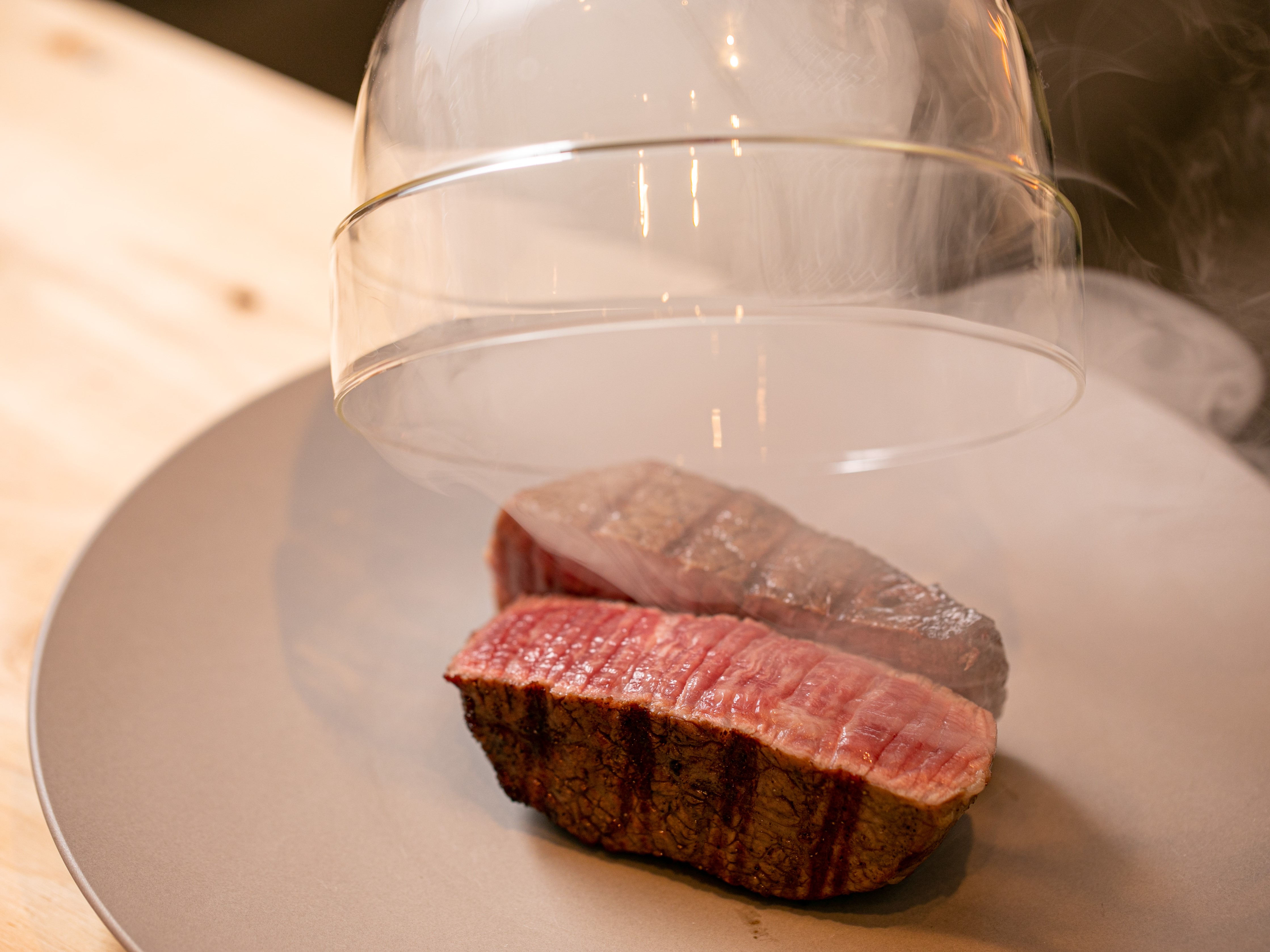 「薪火焼き熟成神戸牛ステーキロッシーニ仕立て」(3,180円)は、フォアグラをのせた神戸牛に薪とローズマリーの煙を器に閉じ込め、お客様の目の前でお開けします。サクラのウッドチップで燻製した「自家製スモークサーモンのカルパッチョ」(800円)や、「薪火で燻した自家製パンチェッタと温玉シーザーサラダ」(1,280円)など、薪火を使ったメニューをご用意しております。