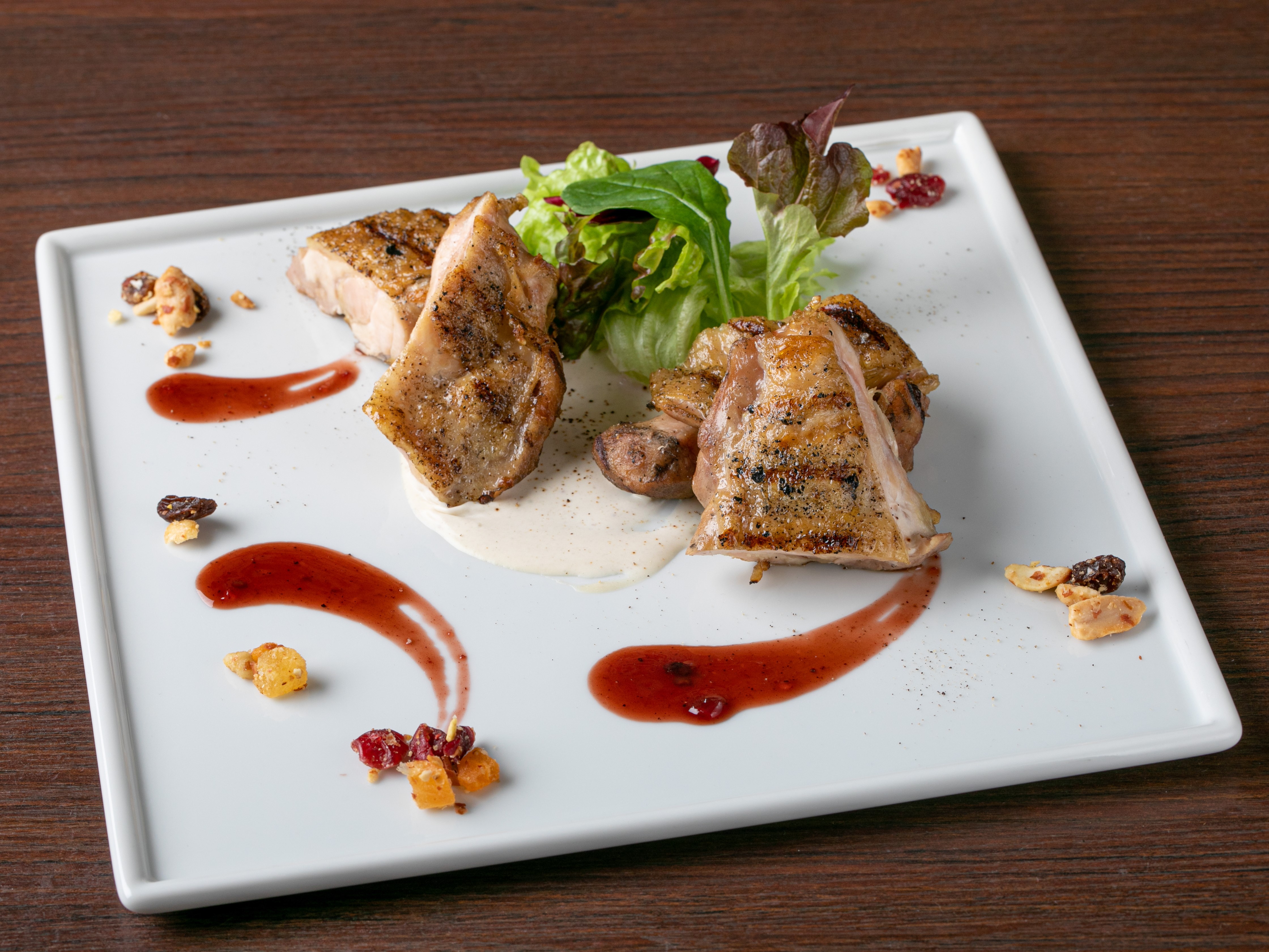 ・熟成淡路鶏の薪焼きグリル ~焦がしバターと赤ワインのソース~(1,380円)